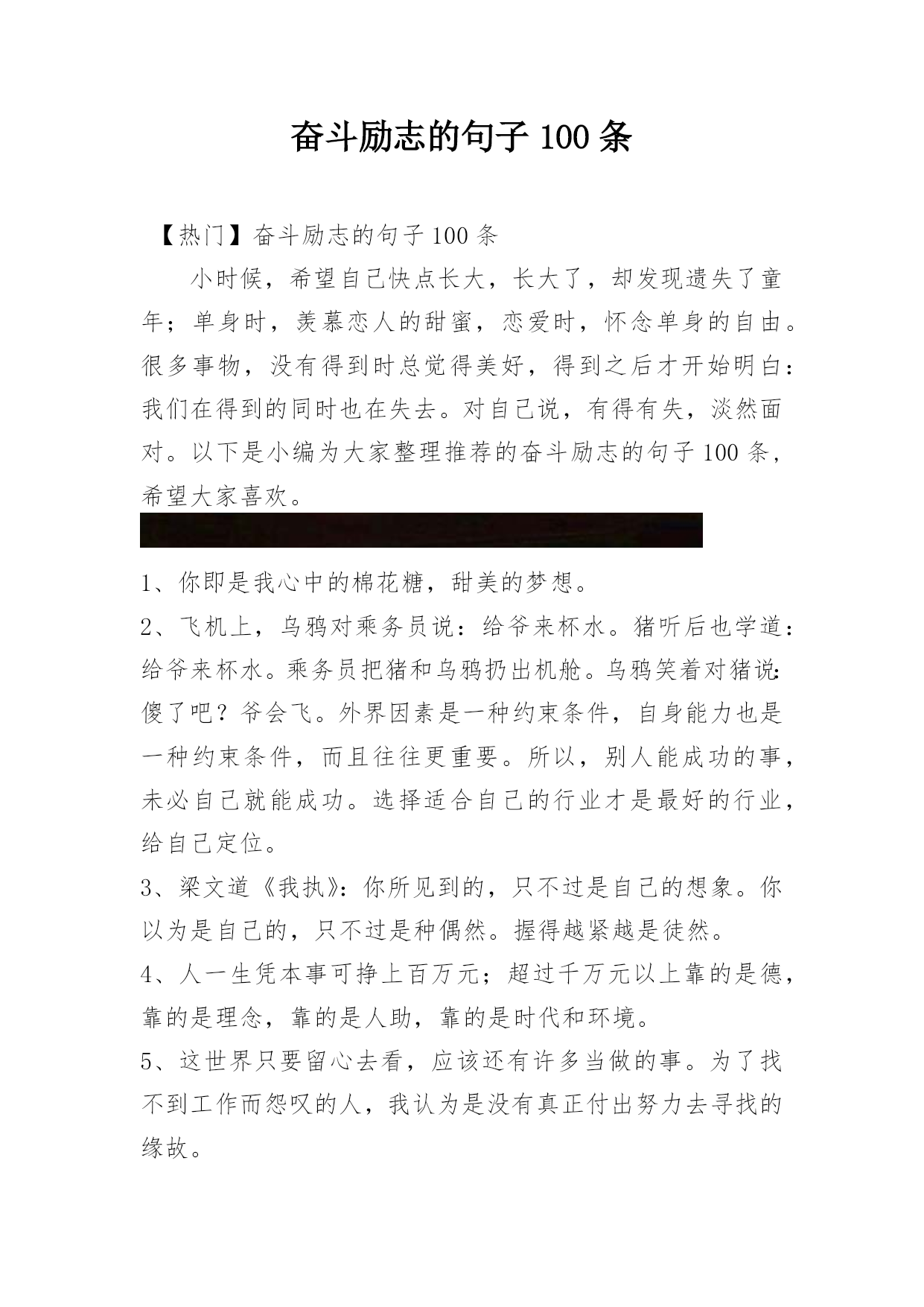 奋斗励志的句子100条【热门】奋斗励志的句子100条小时候,希望自己快点长大,长大了,却发现遗失了童年;单身时,羡慕恋人的甜蜜,恋爱时,怀念单身的自由。很多事物,没有得到时总觉得美好,得到之后才开始明白:我们在得到的同时也在失去。对自己说,有得有失,淡然面对。以下是小编为大家整理推荐的奋斗励志的句子100条,希望大家喜欢。1、你即是我心中的棉花糖,甜美的梦想。2、飞机上,乌鸦对乘务员说:给爷来杯水。猪听后也学道:给爷来杯水。乘务员把猪和乌鸦扔出机舱。乌鸦笑着对猪说:傻了吧?爷会飞。外界因素是一种约束条件,