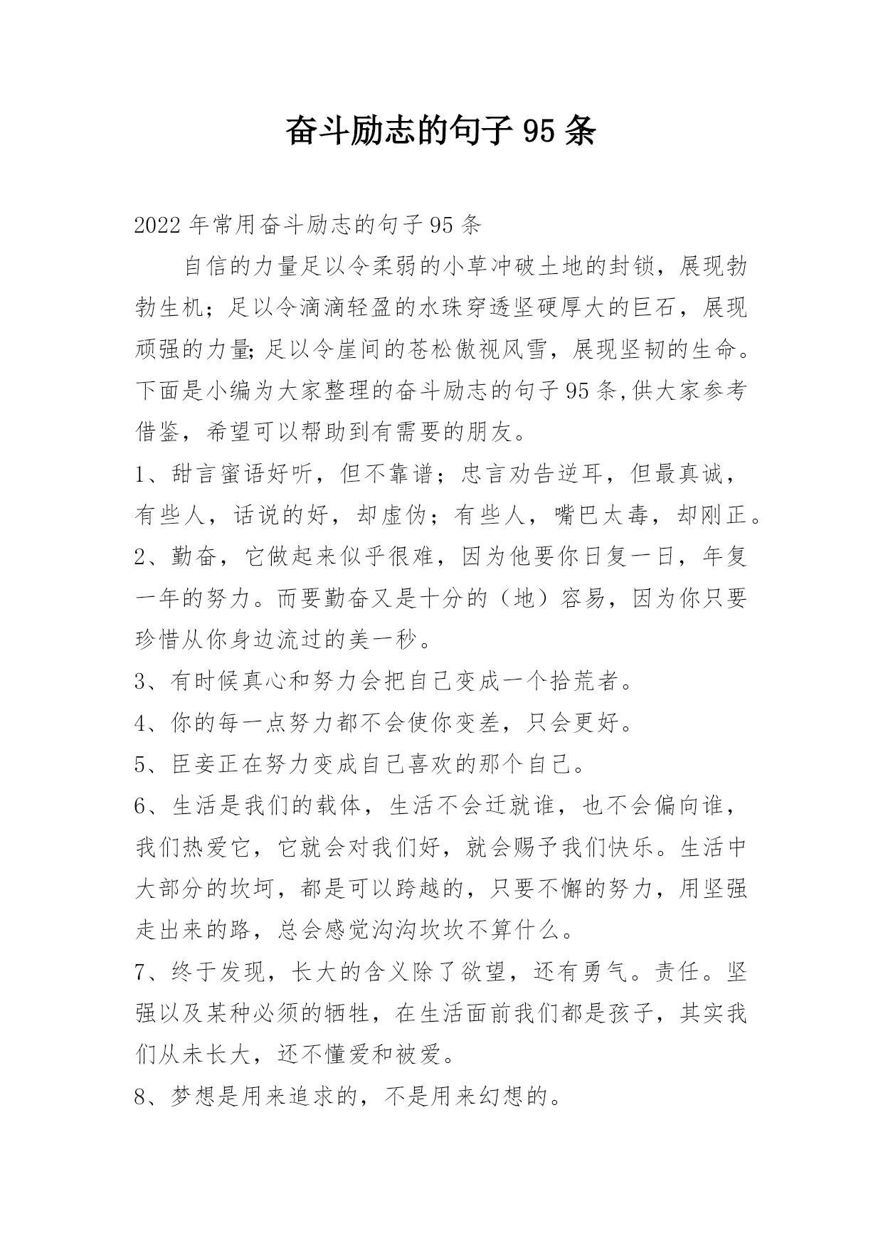 奋斗励志的句子95条2022年常用奋斗励志的句子95条自信的力量足以令柔弱的小草冲破土地的封锁,展现勃勃生机;足以令滴滴轻盈的水珠穿透坚硬厚大的巨石,展现顽强的力量;足以令崖间的苍松傲视风雪,展现坚韧的生命。下面是小编为大家整理的奋斗励志的句子95条,供大家参考借鉴,希望可以帮助到有需要的朋友。1、甜言蜜语好听,但不靠谱;忠言劝告逆耳,但最真诚,有些人,话说的好,却虚伪;有些人,嘴巴太毒,却刚正。2、勤奋,它做起来似乎很难,因为他要你日复一日,年复一年的努力。而要勤奋又是十分的(地)容易,因为你只要珍惜从