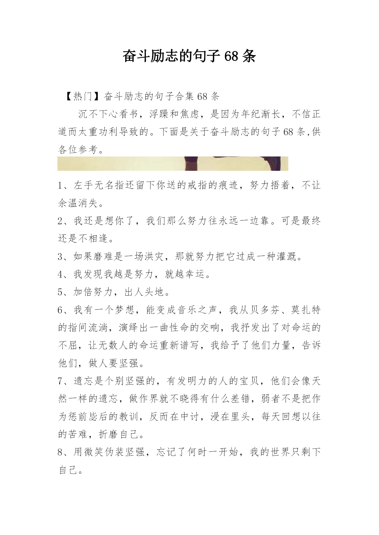 奋斗励志的句子68条【热门】奋斗励志的句子合集68条沉不下心看书,浮躁和焦虑,是因为年纪渐长,不信正道而太重功利导致的。下面是关于奋斗励志的句子68条,供各位参考。1、左手无名指还留下你送的戒指的痕迹,努力捂着,不让余温消失。2、我还是想你了,我们那么努力往永远一边靠。可是最终还是不相逢。3、如果磨难是一场洪灾,那就努力把它过成一种灌溉。4、我发现我越是努力,就越幸运。5、加倍努力,出人头地。6、我有一个梦想,能变成音乐之声,我从贝多芬、莫扎特的指间流淌,演绎出一曲性命的交响,我抒发出了对命运的不屈,让无