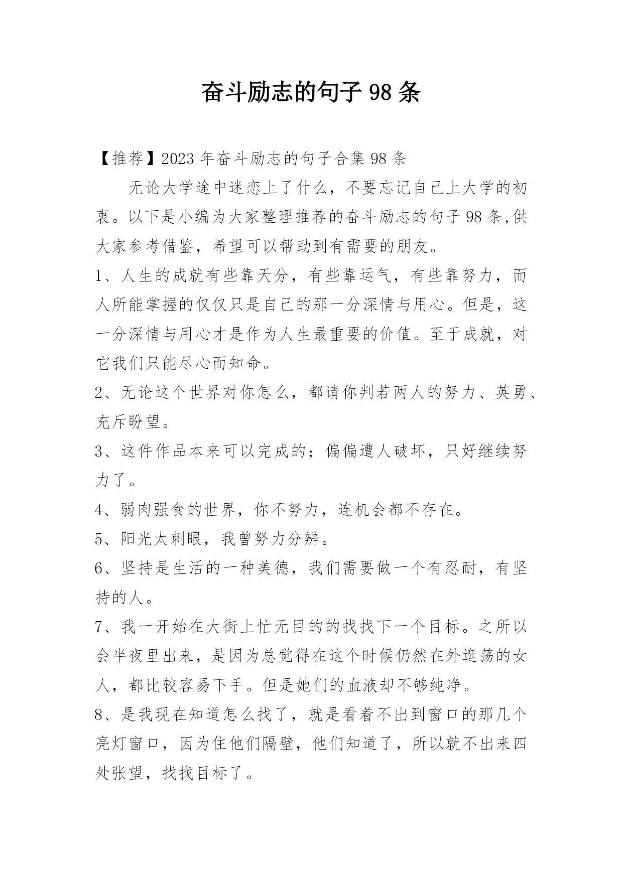 奋斗励志的句子98条【推荐】2023年奋斗励志的句子合集98条无论大学途中迷恋上了什么,不要忘记自己上大学的初衷。以下是小编为大家整理推荐的奋斗励志的句子98条,供大家参考借鉴,希望可以帮助到有需要的朋友。1、人生的成就有些靠天分,有些靠运气,有些靠努力,而人所能掌握的仅仅只是自己的那一分深情与用心。但是,这一分深情与用心才是作为人生最重要的价值。至于成就,对它我们只能尽心而知命。2、无论这个世界对你怎么,都请你判若两人的努力、英勇、充斥盼望。3、这件作品本来可以完成的;偏偏遭人破坏,只好继续努力了。4、