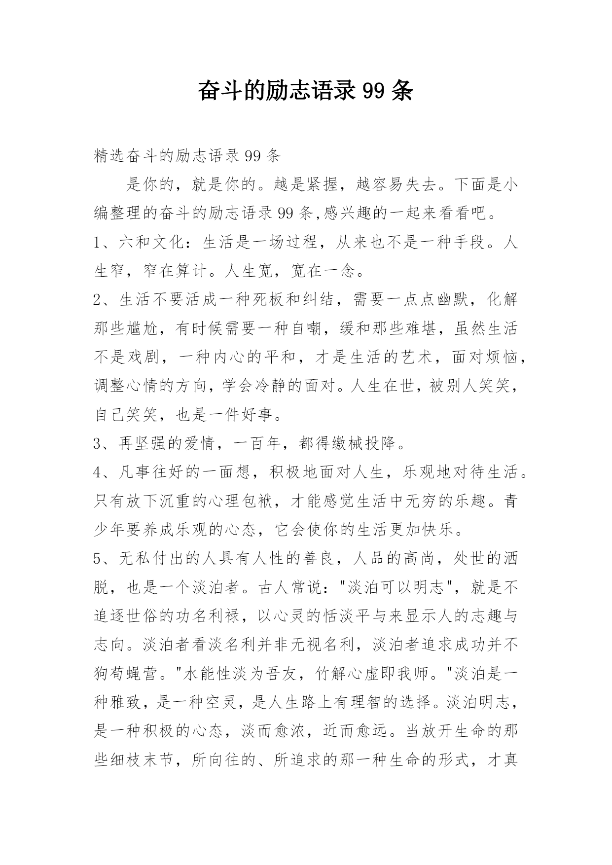 奋斗的励志语录99条精选奋斗的励志语录99条是你的,就是你的。越是紧握,越容易失去。下面是小编整理的奋斗的励志语录99条,感兴趣的一起来看看吧。1、六和文化:生活是一场过程,从来也不是一种手段。人生窄,窄在算计。人生宽,宽在一念。2、生活不要活成一种死板和纠结,需要一点点幽默,化解那些尴尬,有时候需要一种自嘲,缓和那些难堪,虽然生活不是戏剧,一种内心的平和,才是生活的艺术,面对烦恼,调整心情的方向,学会冷静的面对。人生在世,被别人笑笑,自己笑笑,也是一件好事。3、再坚强的爱情,一百年,都得缴械投降。4、凡