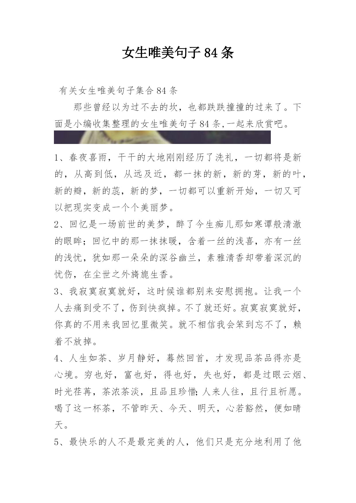 女生唯美句子84条有关女生唯美句子集合84条那些曾经以为过不去的坎,也都跌跌撞撞的过来了。下面是小编收集整理的女生唯美句子84条,一起来欣赏吧。1、春夜喜雨,干干的大地刚刚经历了洗礼,一切都将是新的,从高到低,从远及近,都一抹的新,新的芽,新的叶,新的瓣,新的蕊,新的梦,一切都可以重新开始,一切又可以把现实变成一个个美丽梦。2、回忆是一场前世的美梦,醉了今生痴儿那如寒谭般清澈的眼眸;回忆中的那一抹抹暖,含着一丝的浅喜,亦有一丝的浅忧,犹如那一朵朵的深谷幽兰,素雅清香却带着深沉的忧伤,在尘世之外旖旎生香。3