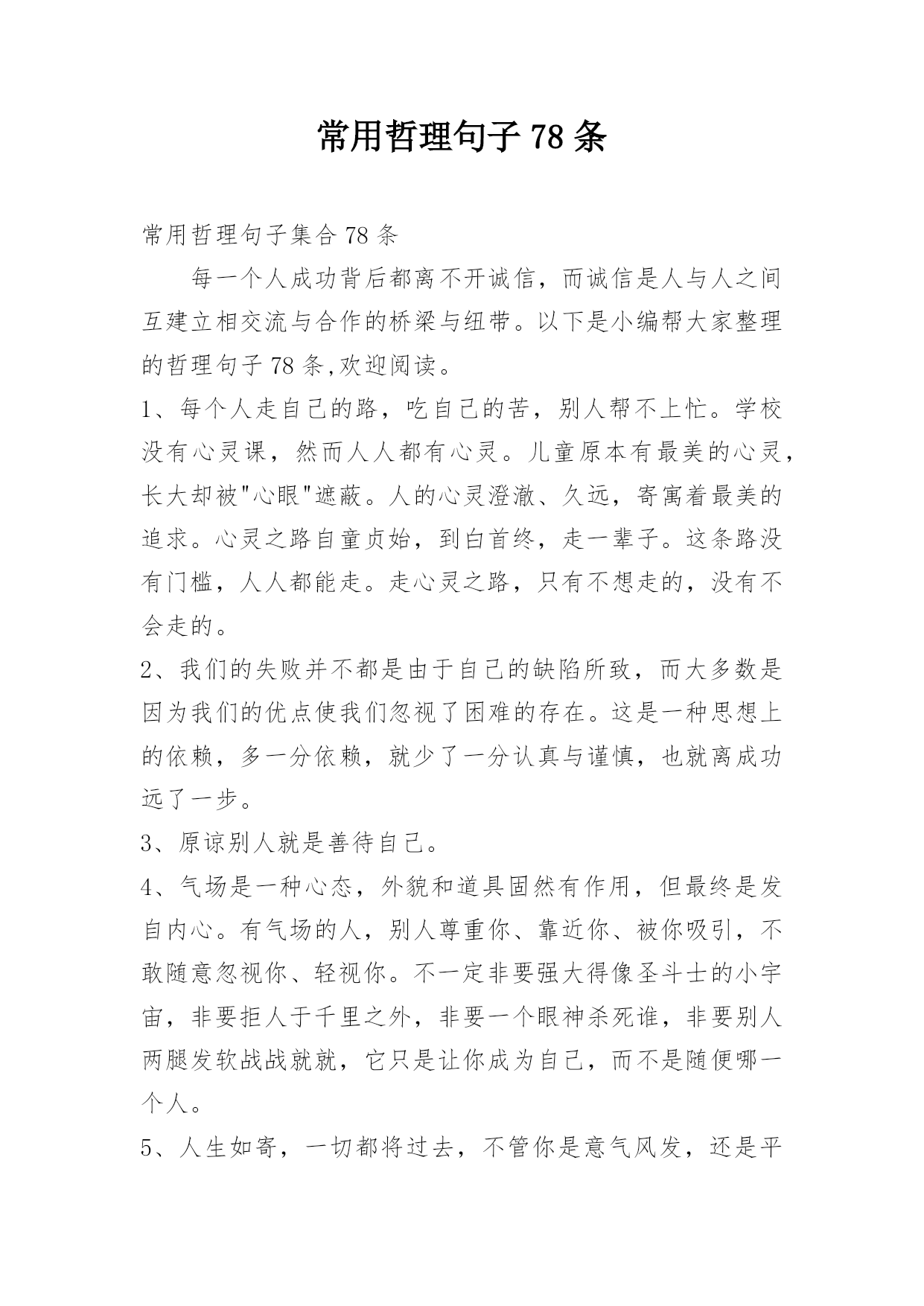 常用哲理句子78条常用哲理句子集合78条每一个人成功背后都离不开诚信,而诚信是人与人之间互建立相交流与合作的桥梁与纽带。以下是小编帮大家整理的哲理句子78条,欢迎阅读。1、每个人走自己的路,吃自己的苦,别人帮不上忙。学校没有心灵课,然而人人都有心灵。儿童原本有最美的心灵,长大却被"心眼"遮蔽。人的心灵澄澈、久远,寄寓着最美的追求。心灵之路自童贞始,到白首终,走一辈子。这条路没有门槛,人人都能走。走心灵之路,只有不想走的,没有不会走的。2、我们的失败并不都是由于自己的缺陷所致,而大多数是因为我们的优点使我们