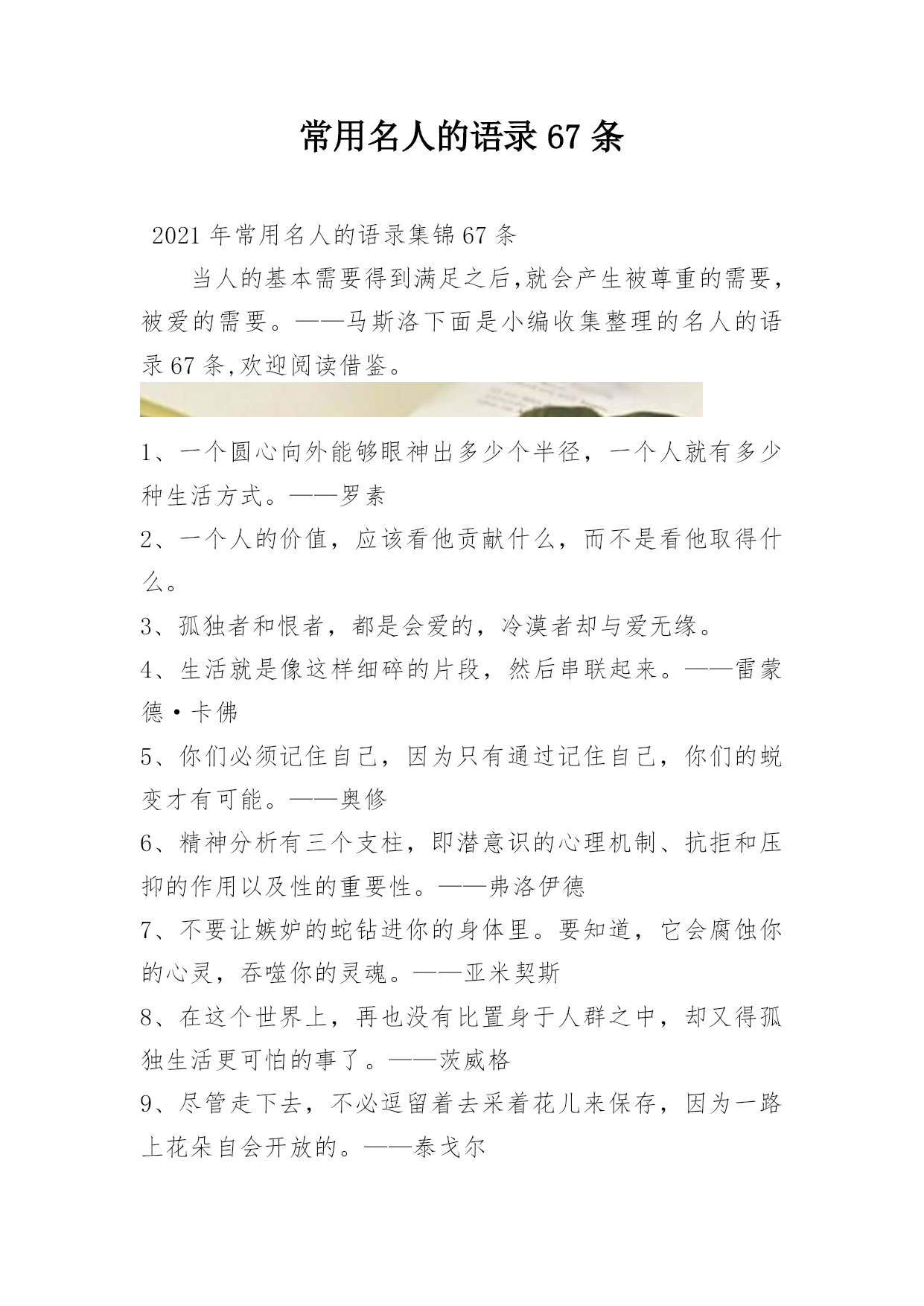 常用名人的语录67条2021年常用名人的语录集锦67条当人的基本需要得到满足之后,就会产生被尊重的需要,被爱的需要。——马斯洛下面是小编收集整理的名人的语录67条,欢迎阅读借鉴。1、一个圆心向外能够眼神出多少个半径,一个人就有多少种生活方式。——罗素2、一个人的价值,应该看他贡献什么,而不是看他取得什么。3、孤独者和恨者,都是会爱的,冷漠者却与爱无缘。4、生活就是像这样细碎的片段,然后串联起来。——雷蒙德·卡佛5、你们必须记住自己,因为只有通过记住自己,你们的蜕变才有可能。——奥修6、精神分析有三个支柱,