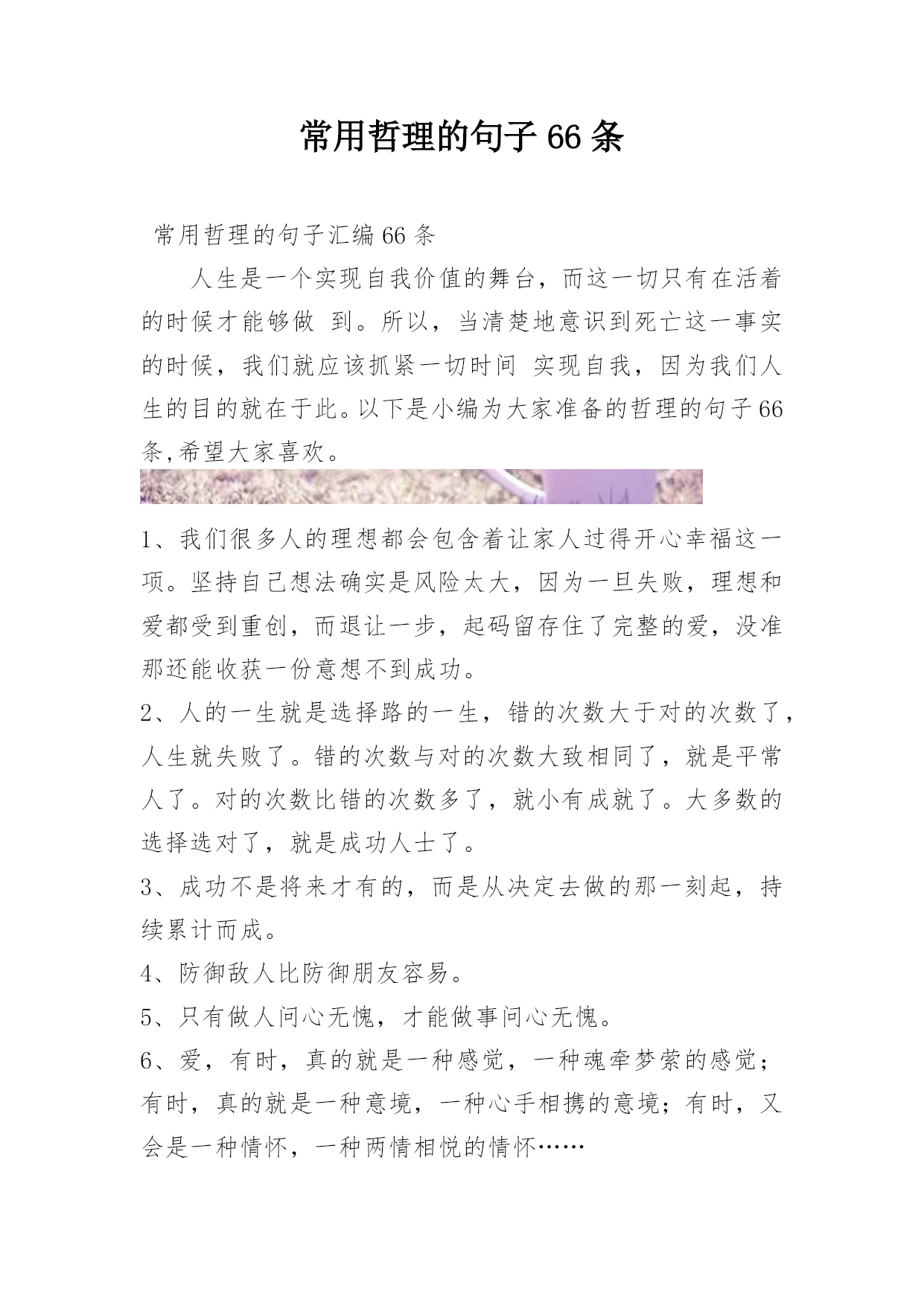 常用哲理的句子66条常用哲理的句子汇编66条人生是一个实现自我价值的舞台,而这一切只有在活着的时候才能够做到。所以,当清楚地意识到死亡这一事实的时候,我们就应该抓紧一切时间实现自我,因为我们人生的目的就在于此。以下是小编为大家准备的哲理的句子66条,希望大家喜欢。1、我们很多人的理想都会包含着让家人过得开心幸福这一项。坚持自己想法确实是风险太大,因为一旦失败,理想和爱都受到重创,而退让一步,起码留存住了完整的爱,没准那还能收获一份意想不到成功。2、人的一生就是选择路的一生,错的次数大于对的次数了,人生就失
