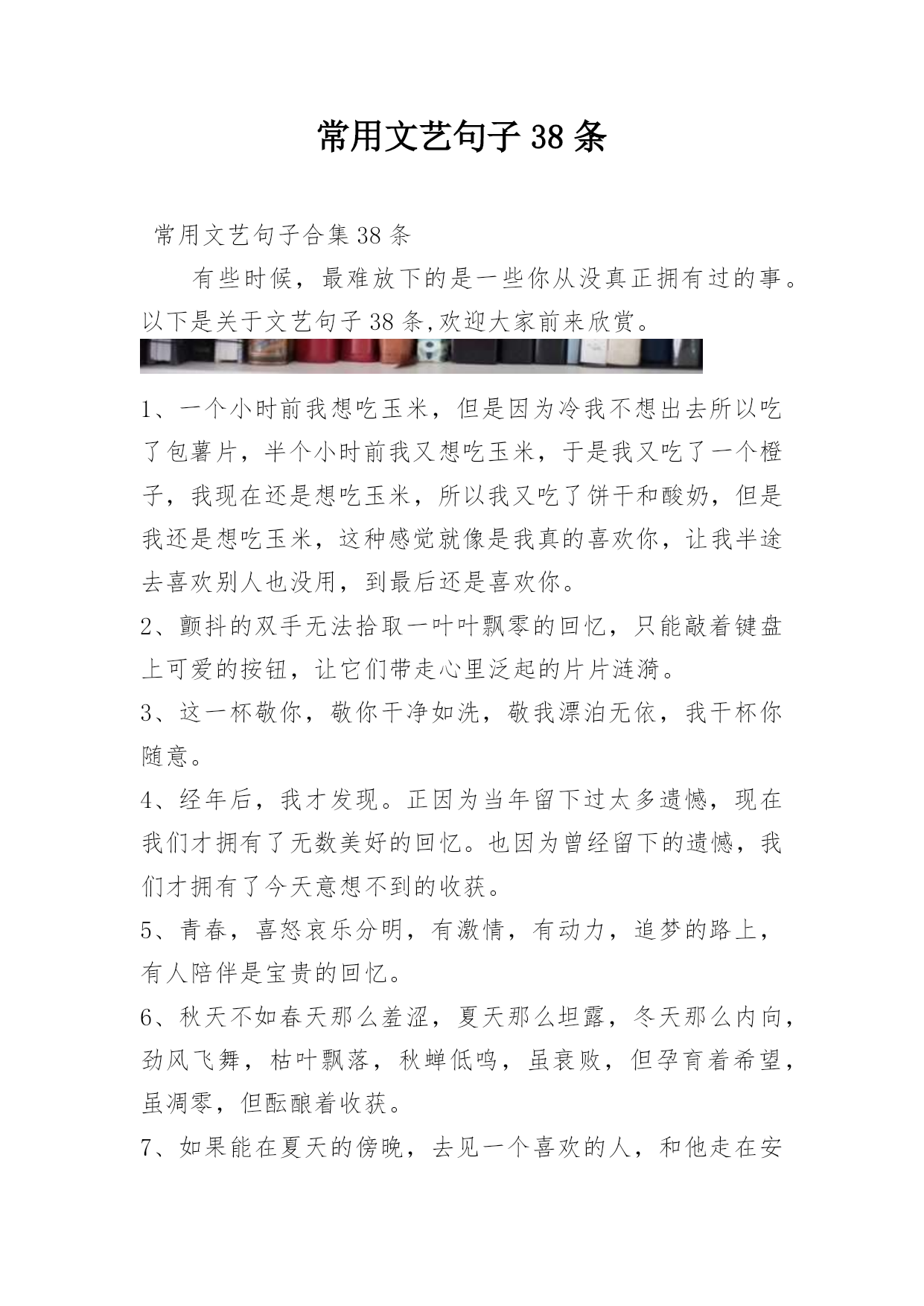 常用文艺句子38条常用文艺句子合集38条有些时候,最难放下的是一些你从没真正拥有过的事。以下是关于文艺句子38条,欢迎大家前来欣赏。1、一个小时前我想吃玉米,但是因为冷我不想出去所以吃了包薯片,半个小时前我又想吃玉米,于是我又吃了一个橙子,我现在还是想吃玉米,所以我又吃了饼干和酸奶,但是我还是想吃玉米,这种感觉就像是我真的喜欢你,让我半途去喜欢别人也没用,到最后还是喜欢你。2、颤抖的双手无法拾取一叶叶飘零的回忆,只能敲着键盘上可爱的按钮,让它们带走心里泛起的片片涟漪。3、这一杯敬你,敬你干净如洗,敬我漂泊
