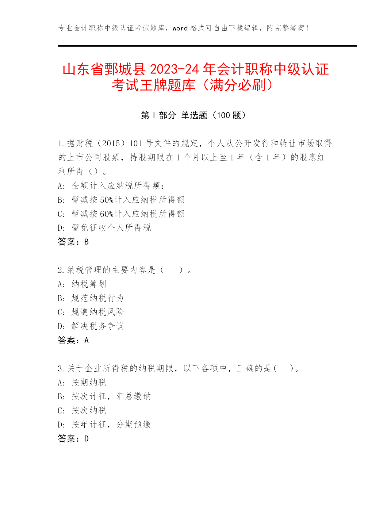 山东省鄄城县2023-24年会计职称中级认证考试王牌题库(满分必刷).docx