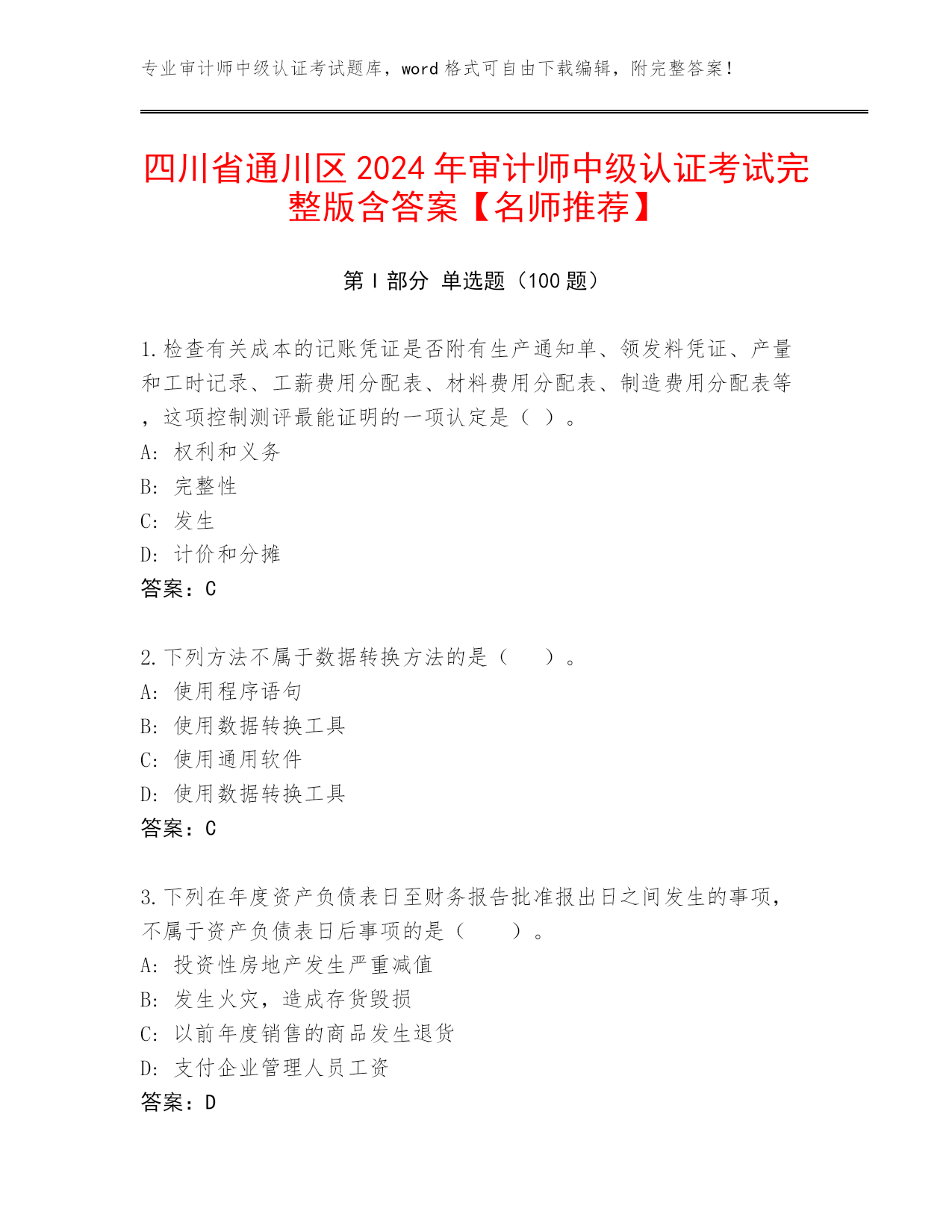 四川省通川区2024年审计师中级认证考试完整版含答案【名师推荐】.docx