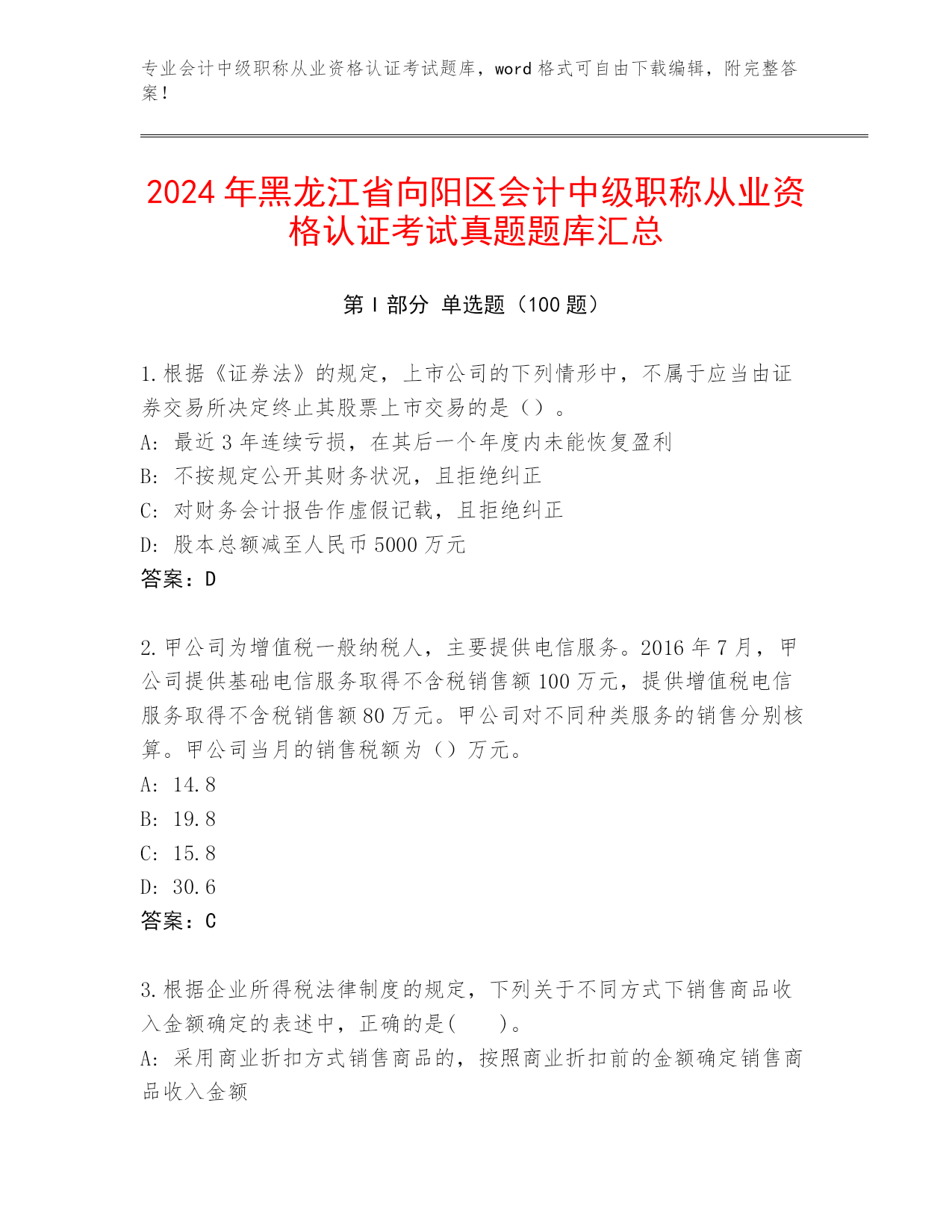 2024年黑龙江省向阳区会计中级职称从业资格认证考试真题题库汇总.docx