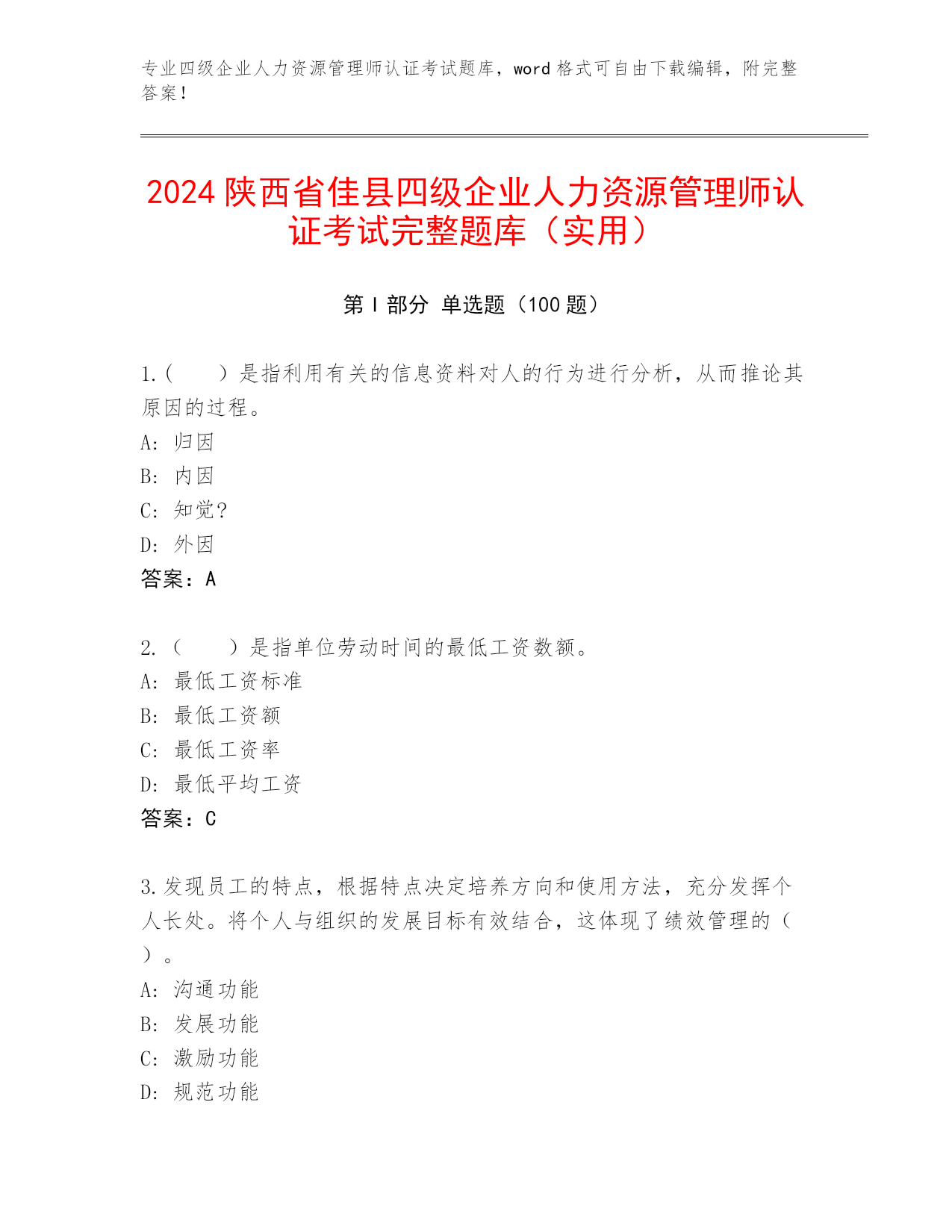 2024陕西省佳县四级企业人力资源管理师认证考试完整题库(实用).docx