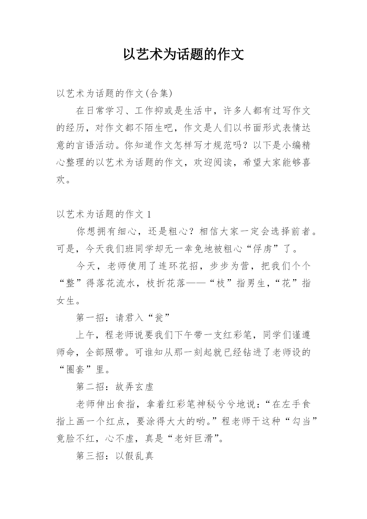 以艺术为话题的作文以艺术为话题的作文(合集)在日常学习、工作抑或是生活中,许多人都有过写作文的经历,对作文都不陌生吧,作文是人们以书面形式表情达意的言语活动。你知道作文怎样写才规范吗?以下是小编精心整理的以艺术为话题的作文,欢迎阅读,希望大家能够喜欢。以艺术为话题的作文1你想拥有细心,还是粗心?相信大家一定会选择前者。可是,今天我们班同学却无一幸免地被粗心“俘虏”了。今天,老师使用了连环花招,步步为营,把我们个个“整”得落花流水,枝折花落——“枝”指男生,“花”指女生。第一招:请君入“瓮”上午,程老师说要