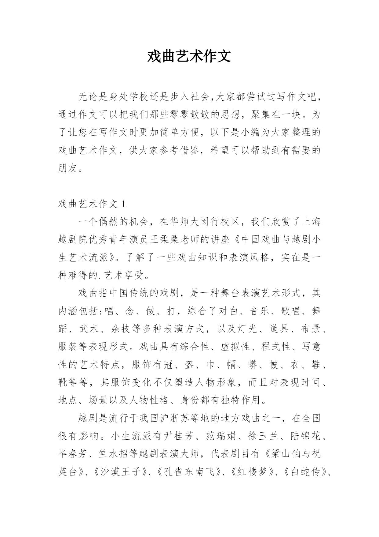 戏曲艺术作文无论是身处学校还是步入社会,大家都尝试过写作文吧,通过作文可以把我们那些零零散散的思想,聚集在一块。为了让您在写作文时更加简单方便,以下是小编为大家整理的戏曲艺术作文,供大家参考借鉴,希望可以帮助到有需要的朋友。戏曲艺术作文1一个偶然的机会,在华师大闵行校区,我们欣赏了上海越剧院优秀青年演员王柔桑老师的讲座《中国戏曲与越剧小生艺术流派》。了解了一些戏曲知识和表演风格,实在是一种难得的.艺术享受。戏曲指中国传统的戏剧,是一种舞台表演艺术形式,其内涵包括:唱、念、做、打,综合了对白、音乐、歌唱、舞