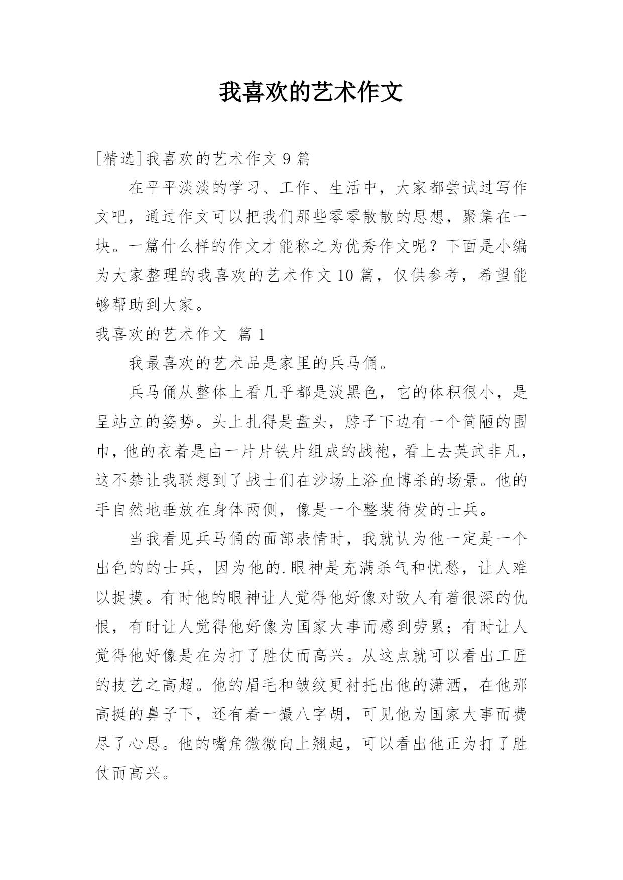 我喜欢的艺术作文[精选]我喜欢的艺术作文9篇在平平淡淡的学习、工作、生活中,大家都尝试过写作文吧,通过作文可以把我们那些零零散散的思想,聚集在一块。一篇什么样的作文才能称之为优秀作文呢?下面是小编为大家整理的我喜欢的艺术作文10篇,仅供参考,希望能够帮助到大家。我喜欢的艺术作文篇1我最喜欢的艺术品是家里的兵马俑。兵马俑从整体上看几乎都是淡黑色,它的体积很小,是呈站立的姿势。头上扎得是盘头,脖子下边有一个简陋的围巾,他的衣着是由一片片铁片组成的战袍,看上去英武非凡,这不禁让我联想到了战士们在沙场上浴血博杀的