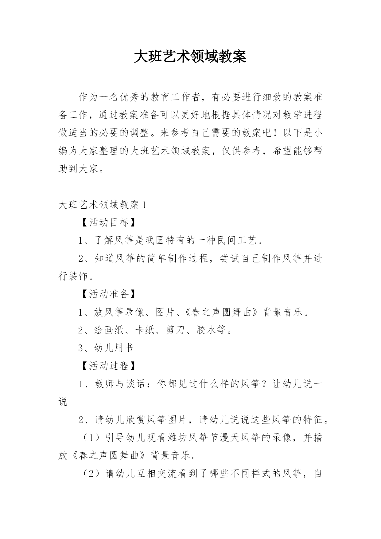 大班艺术领域教案作为一名优秀的教育工作者,有必要进行细致的教案准备工作,通过教案准备可以更好地根据具体情况对教学进程做适当的必要的调整。来参考自己需要的教案吧!以下是小编为大家整理的大班艺术领域教案,仅供参考,希望能够帮助到大家。大班艺术领域教案1【活动目标】1、了解风筝是我国特有的一种民间工艺。2、知道风筝的简单制作过程,尝试自己制作风筝并进行装饰。【活动准备】1、放风筝录像、图片、《春之声圆舞曲》背景音乐。2、绘画纸、卡纸、剪刀、胶水等。3、幼儿用书【活动过程】1、教师与谈话:你都见过什么样的风筝?让