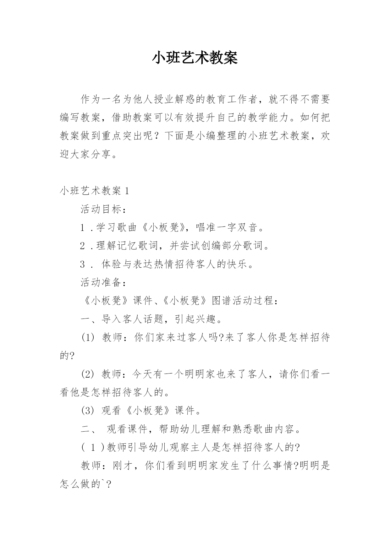 小班艺术教案作为一名为他人授业解惑的教育工作者,就不得不需要编写教案,借助教案可以有效提升自己的教学能力。如何把教案做到重点突出呢?下面是小编整理的小班艺术教案,欢迎大家分享。小班艺术教案1活动目标:1.学习歌曲《小板凳》,唱准一字双音。2.理解记忆歌词,并尝试创编部分歌词。3.体验与表达热情招待客人的快乐。活动准备:《小板凳》课件、《小板凳》图谱活动过程:一、导入客人话题,引起兴趣。(1)教师:你们家来过客人吗?来了客人你是怎样招待的?(2)教师:今天有一个明明家也来了客人,请你们看一看他是怎样招待客人