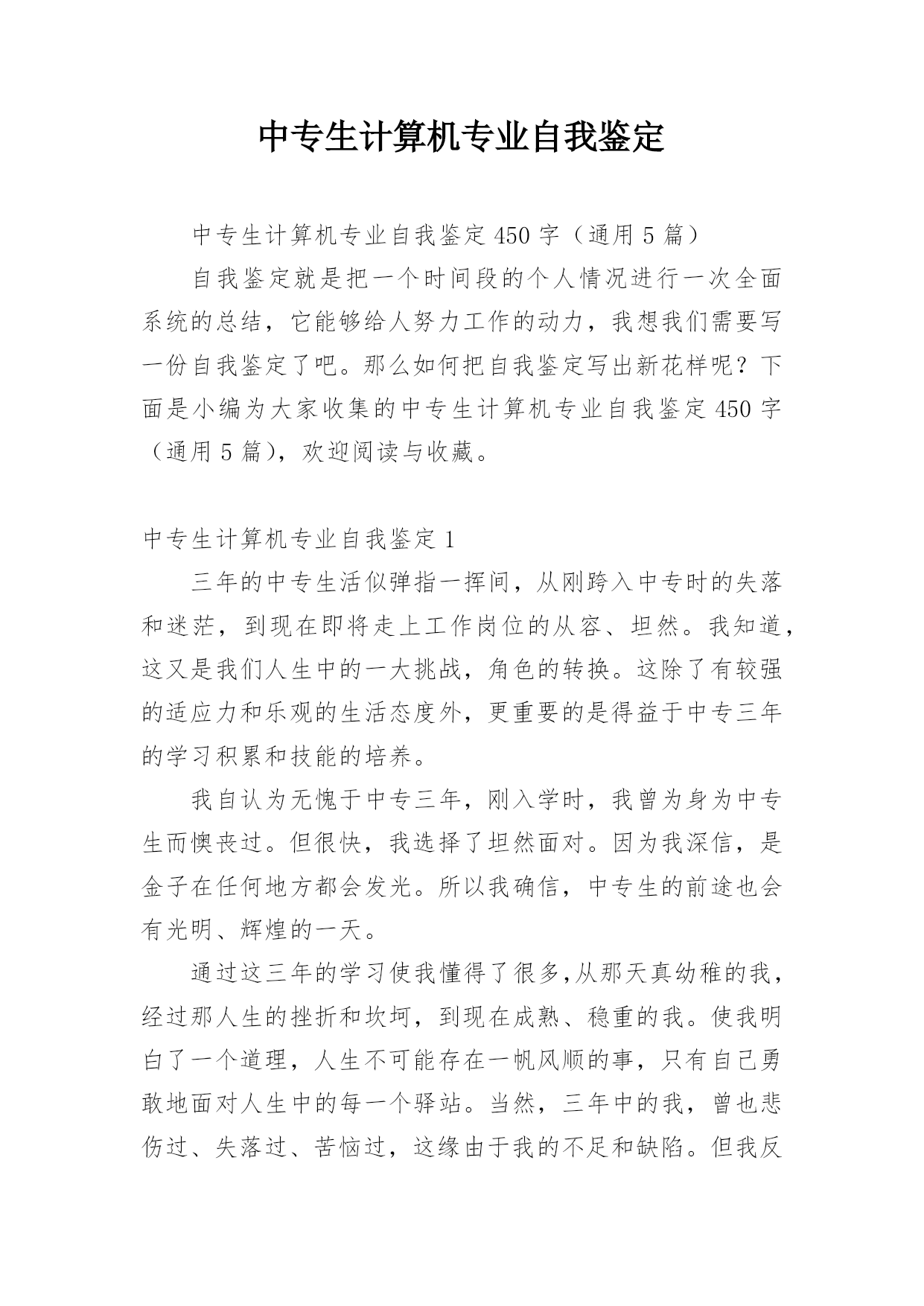 中专生计算机专业自我鉴定中专生计算机专业自我鉴定450字(通用5篇)自我鉴定就是把一个时间段的个人情况进行一次全面系统的总结,它能够给人努力工作的动力,我想我们需要写一份自我鉴定了吧。那么如何把自我鉴定写出新花样呢?下面是小编为大家收集的中专生计算机专业自我鉴定450字(通用5篇),欢迎阅读与收藏。中专生计算机专业自我鉴定1三年的中专生活似弹指一挥间,从刚跨入中专时的失落和迷茫,到现在即将走上工作岗位的从容、坦然。我知道,这又是我们人生中的一大挑战,角色的转换。这除了有较强的适应力和乐观的生活态度外,更重