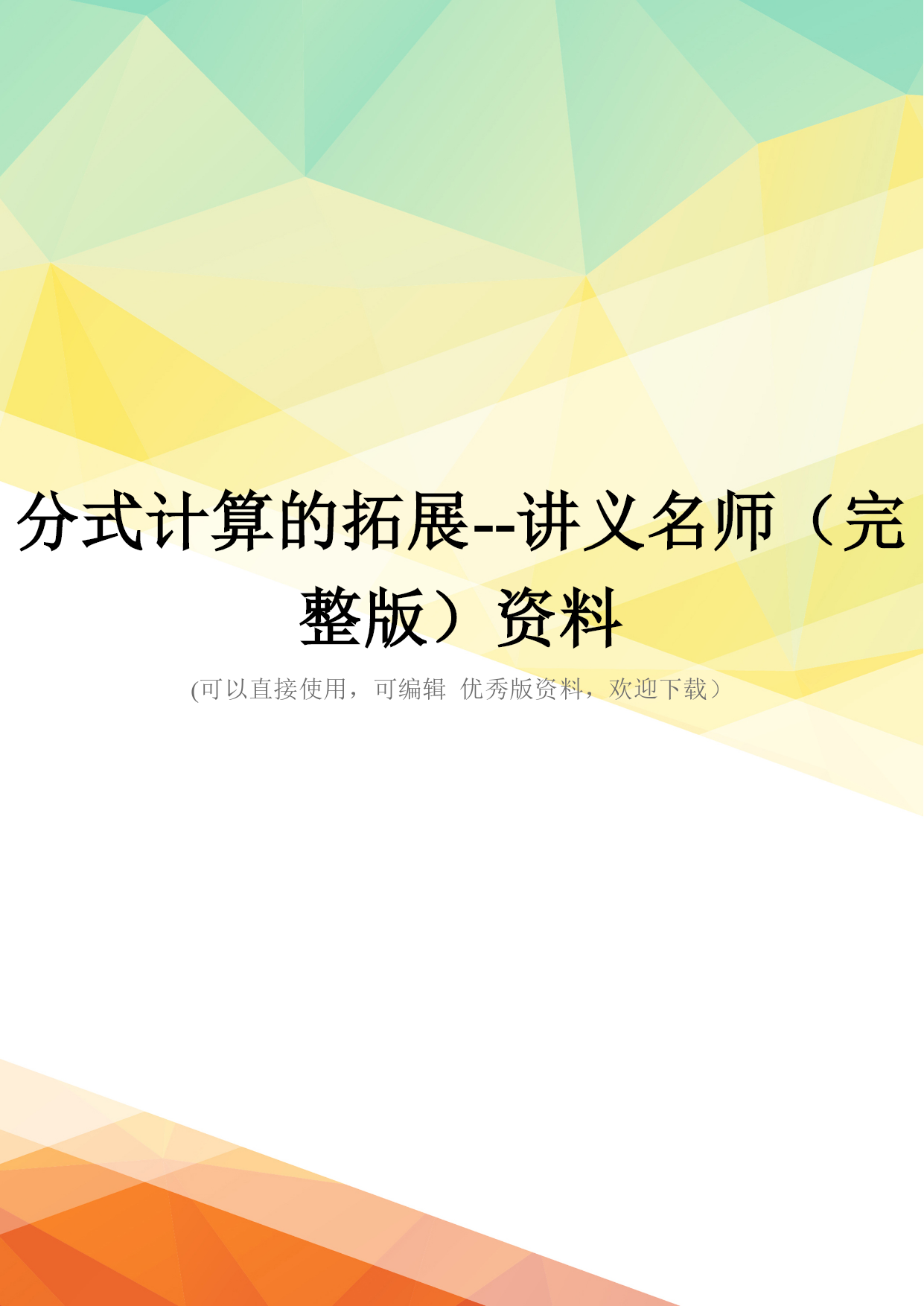 分式计算的拓展--讲义名师(完整版)资料(可以直接使用,可编辑优秀版资料,欢迎下载)分式计算的拓展重难点易错点辨析题一:计算:考点:负指数幂、零指数幂题二:已知,求的值.考点:分式的条件化简求值题三:已知x>4,求与的大小关系.考点:分式比大小金题精讲题一:已知:,且x为整数.则A与B有什么关系?考点:负指数幂题二:某公司组织活动,a个人参加,公司给活动经费b(百元),现在又有m个人参加活动,公司决定增加经费m(百元),问人均经费是否有变化?说明理由.考点:分式比大小题三:已知:,则的值为.考点:分式