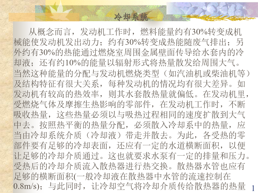 冷却系统从概念而言,发动机工作时,燃料能量约有30%转变成机械能使发动机发出动力;约有30%转变成热能随废气排出;另外约有30%的热能通过燃烧室周围金属壁面传导给水套内的冷却液;还有约10%的能量以辐射形式将热量散发给周围大气。当然这种能量的分配与发动机燃烧类型(如汽油机或柴油机等)及结构特征有很大关系,每种发动机的情况均有很大差异。如发动机有较高的热效率,则其水套散热量就偏低。在发动机里,受燃烧气体及摩擦生热影响的零部件,在发动机工作时,不断吸收热量,这些热量必须以与吸热过程相同的速度扩散到大气中去。按