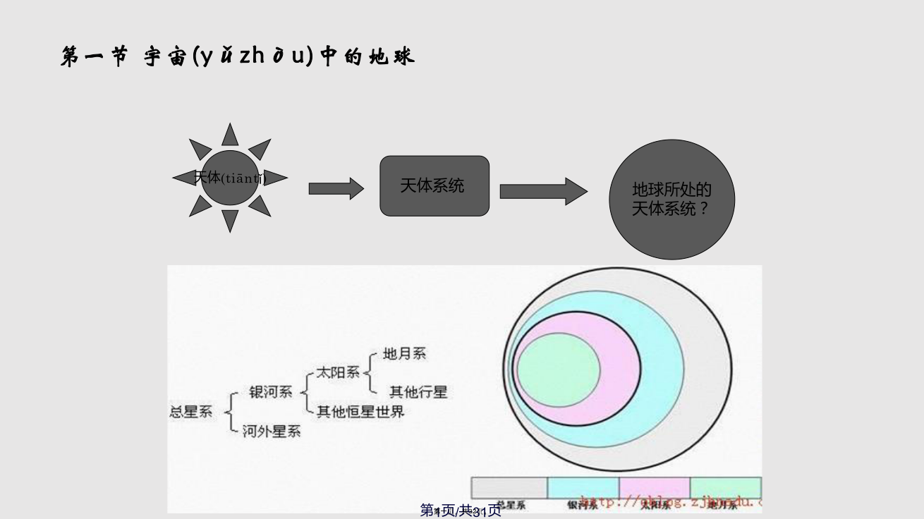 第一节宇宙(yǔzhòu)中的地球普通的行星1太阳系的八大行星水金地火木土天王(tiānwáng)海王2行星分类类地,远日,巨行星3行星运行轨道的特性共面,近圆,同向第二节太阳对地球(dìqiú)的影响太阳(tàiyáng)大气层结构太阳活动(tàiyánꞬhuódònꞬ)对地球的影响小结(xiǎojié)第三节地球(dìqiú)的运动地转偏向(piānxiàng)力昼夜(zhòuyè)交替晨昏(chénhūn)线判读地方(dìfāng)时时区划分与时差(shíchā)计算地球(dìqiú)的公转近日点和