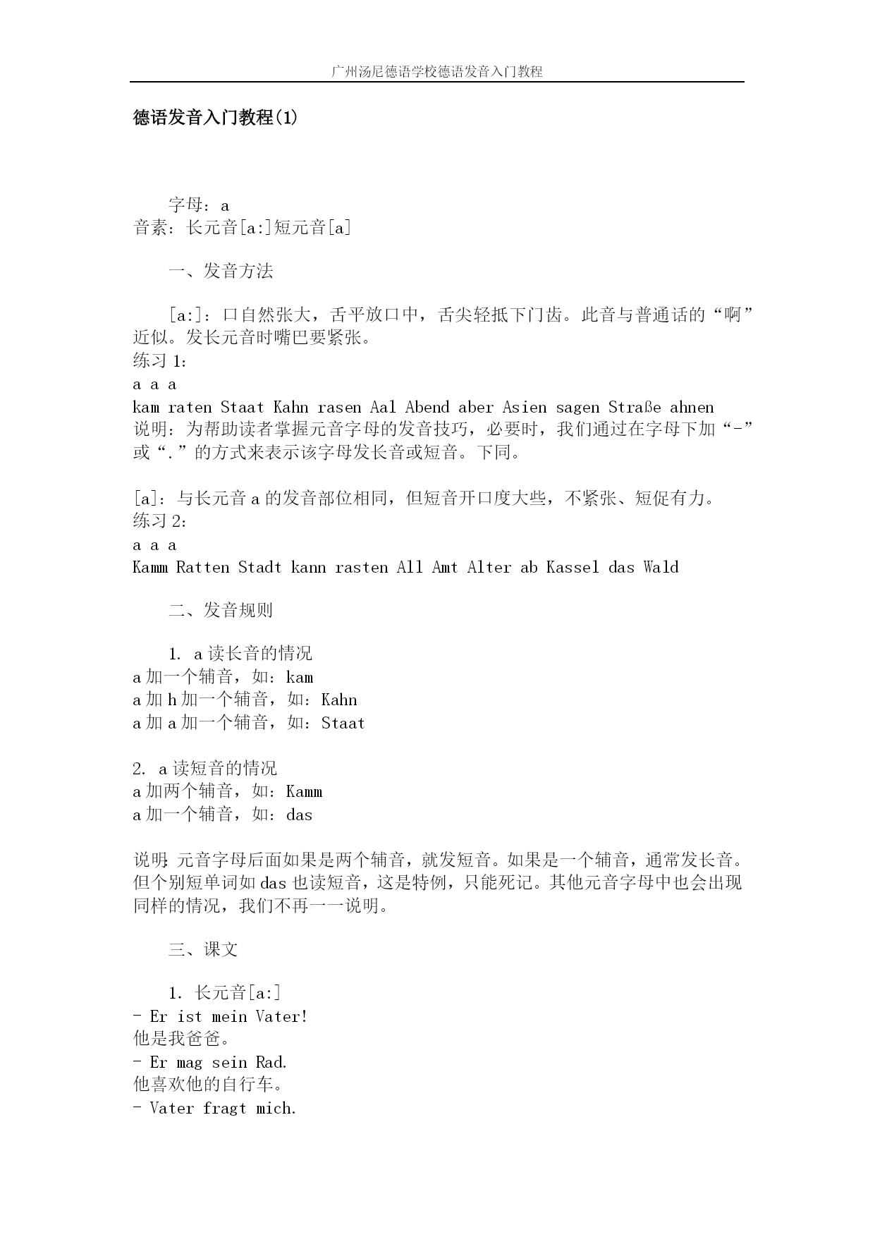 广州汤尼德语学校德语发音入门教程德语发音入门教程(1)字母:a音素:长元音[a:]短元音[a]一、发音方法[a:]:口自然张大,舌平放口中,舌尖轻抵下门齿。此音与普通话的“啊”近似。发长元音时嘴巴要紧张。练习1:aaakamratenStaatKahnrasenAalAbendaberAsiensagenStraßeahnen说明:为帮助读者掌握元音字母的发音技巧,必要时,我们通过在字母下加“-”或“.”的方式来表示该字母发长音或短音。下同。[a]:与长元音a的发音部位相同,但短音开口度大些,不紧张、短促