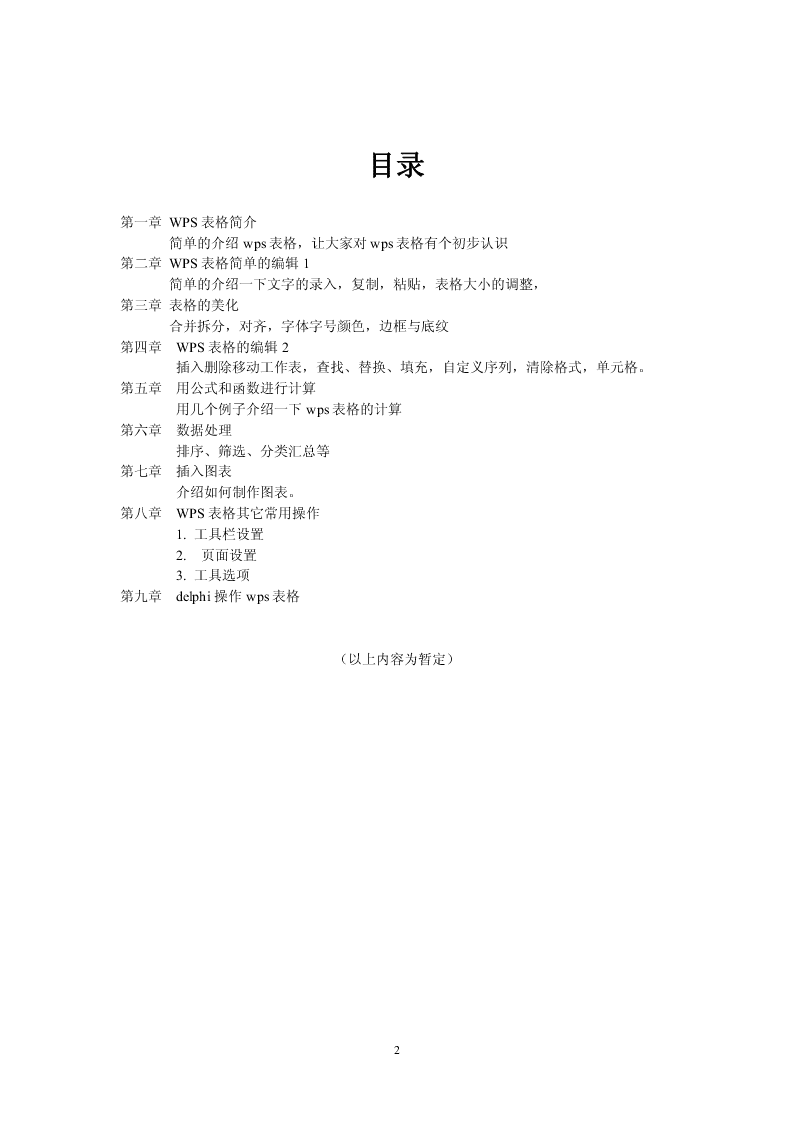 WPS表格初级教程目录第一章WPS表格简介简单的介绍wps表格,让大家对wps表格有个初步认识第二章WPS表格简单的编辑1简单的介绍一下文字的录入,复制,粘贴,表格大小的调整,第三章表格的美化合并拆分,对齐,字体字号颜色,边框与底纹第四章WPS表格的编辑2插入删除移动工作表,查找、替换、填充,自定义序列,清除格式,单元格。第五章用公式和函数进行计算用几个例子介绍一下wps表格的计算第六章数据处理排序、筛选、分类汇总等第七章插入图表介绍如何制作图表。第八章WPS表格其它常用操作1.工具栏设置2.页面设置3.