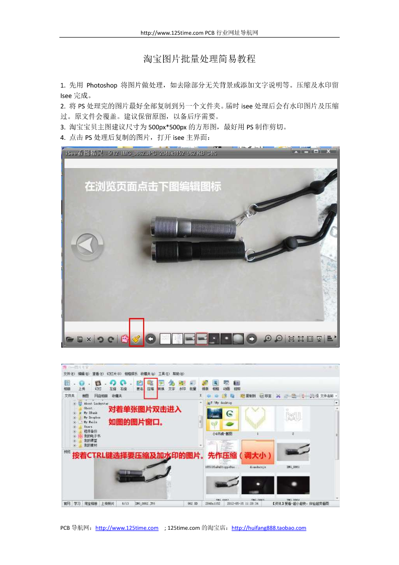 http://www.125time.comPCB行业网址导航网淘宝图片批量处理简易教程1.先用Photoshop将图片做处理,如去除部分无关背景或添加文字说明等。压缩及水印留Isee完成。2.将PS处理完的图片最好全部复制到另一个文件夹。届时isee处理后会有水印图片及压缩过。原文件会覆盖。建议保留原图,以备后序需要。3.淘宝宝贝主图建议尺寸为500px*500px的方形图,最好用PS制作剪切。4.点击PS处理后复制的图片,打开isee主界面:PCB导航网:http://www.125time.com;