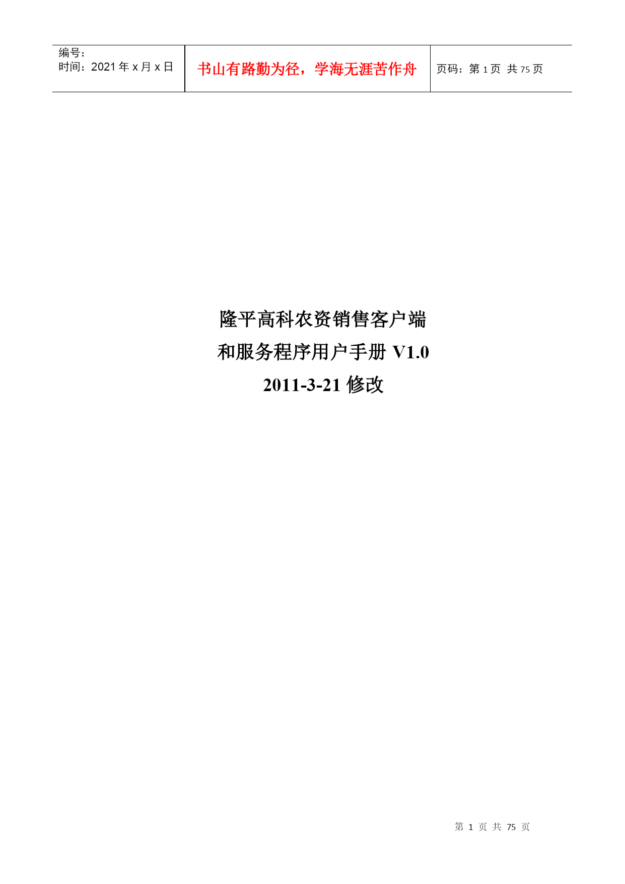 编号:时间:2021年x月x日书山有路勤为径,学海无涯苦作舟页码:第PAGE75页共NUMPAGES75页第PAGE\*MERGEFORMAT75页共NUMPAGES\*MERGEFORMAT75页隆平高科农资销售客户端和服务程序用户手册V1.02011-3-21修改目录TOC\o"1-3"\h\zHYPERLINK\l"_Toc240177317"一、软件安装PAGEREF_Toc240177317\h4HYPERLINK\l"_Toc240177318"1.