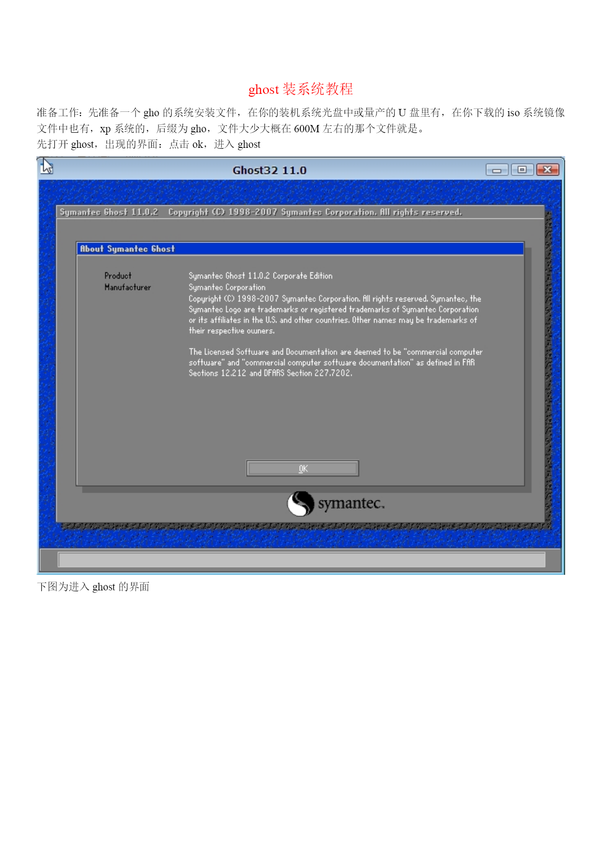 ghost装系统教程准备工作:先准备一个gho的系统安装文件,在你的装机系统光盘中或量产的U盘里有,在你下载的iso系统镜像文件中也有,xp系统的,后缀为gho,文件大少大概在600M左右的那个文件就是。先打开ghost,出现的界面:点击ok,进入ghost下图为进入ghost的界面现在只介绍装系统的步骤:依次点击:①local—②partition—③fromimage跳出的窗口如下:在下拉的浏览列表中,选择你的gho文件的位置。最好将gho文件放在根目录,这样容易找到,ghost软件对文件夹名为中文的