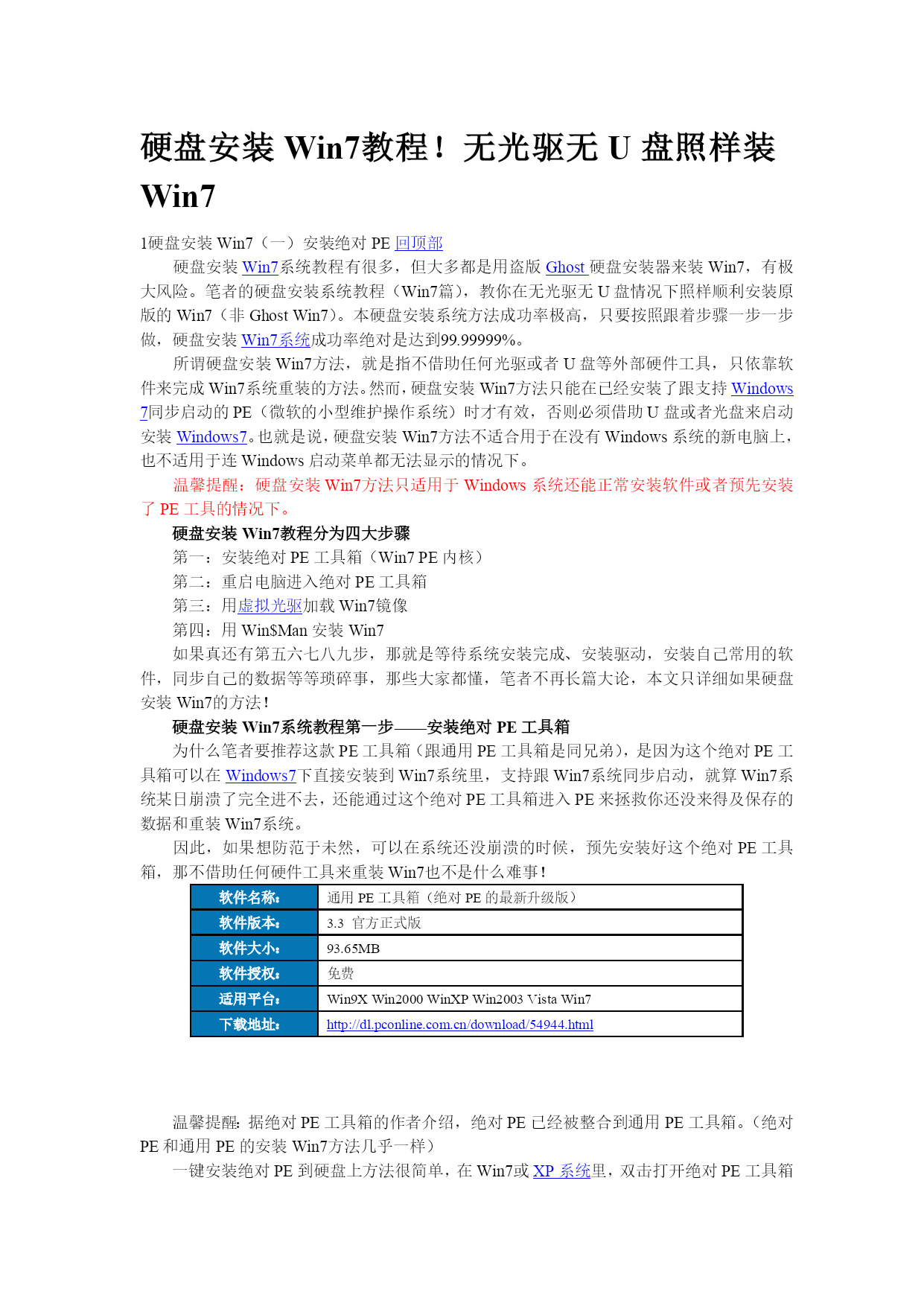 硬盘安装Win7教程!无光驱无U盘照样装Win71硬盘安装Win7(一)安装绝对PEHYPERLINK\l"article_brief"回顶部硬盘安装HYPERLINK"http://pcedu.pconline.com.cn/windows7/"Win7系统教程有很多,但大多都是用盗版HYPERLINK"http://dl.pconline.com.cn/html_2/1/59/id=10125&pn=0.html"Ghost硬盘安装器来装Win7,有极大风险。笔者的硬盘安装系统教程(