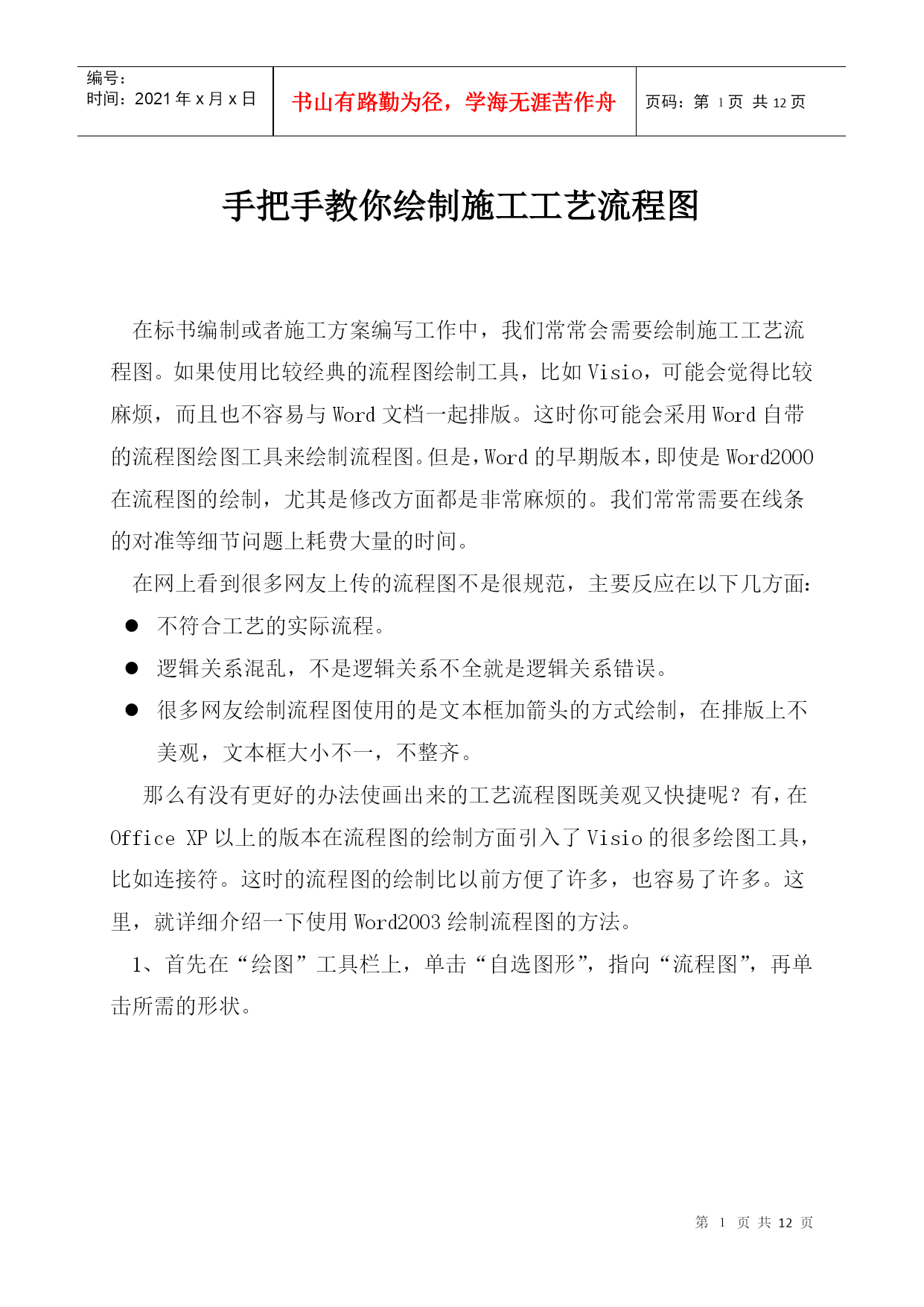 编号:时间:2021年x月x日书山有路勤为径,学海无涯苦作舟页码:第PAGE12页共NUMPAGES12页第PAGE\*MERGEFORMAT12页共NUMPAGES\*MERGEFORMAT12页手把手教你绘制施工工艺流程图在标书编制或者施工方案编写工作中,我们常常会需要绘制施工工艺流程图。如果使用比较经典的流程图绘制工具,比如Visio,可能会觉得比较麻烦,而且也不容易与Word文档一起排版。这时你可能会采用Word自带的流程图绘图工具来绘制流程图。但是,Word的早期版本,即