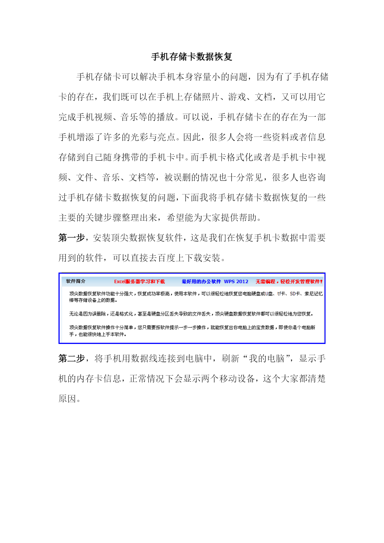 手机存储卡数据恢复手机存储卡可以解决手机本身容量小的问题,因为有了手机存储卡的存在,我们既可以在手机上存储照片、游戏、文档,又可以用它完成手机视频、音乐等的播放。可以说,手机存储卡在的存在为一部手机增添了许多的光彩与亮点。因此,很多人会将一些资料或者信息存储到自己随身携带的手机卡中。而手机卡格式化或者是手机卡中视频、文件、音乐、文档等,被误删的情况也十分常见,很多人也咨询过手机存储卡数据恢复的问题,下面我将手机存储卡数据恢复的一些主要的关键步骤整理出来,希望能为大家提供帮助。第一步,安装顶尖数据恢复软件,