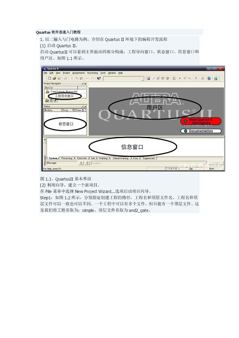 Quartus软件急速入门教程1.以二输入与门电路为例,介绍在QuartusII环境下的编程开发流程(1)启动QuartusII。启动QuartusII可以看到主界面由四部分构成:工程导向窗口、状态窗口、信息窗口和用户区。如图1.1所示。图1.1、QuartusII基本界面(2)利用向导,建立一个新项目。在File菜单中选择NewProjectWizard...选项启动项目向导。Step1:如图1.2所示,分别指定创建工程的路径,工程名和顶层文件名。工程名和顶层文件可以一致也可以不同。一个工程中可以有多个