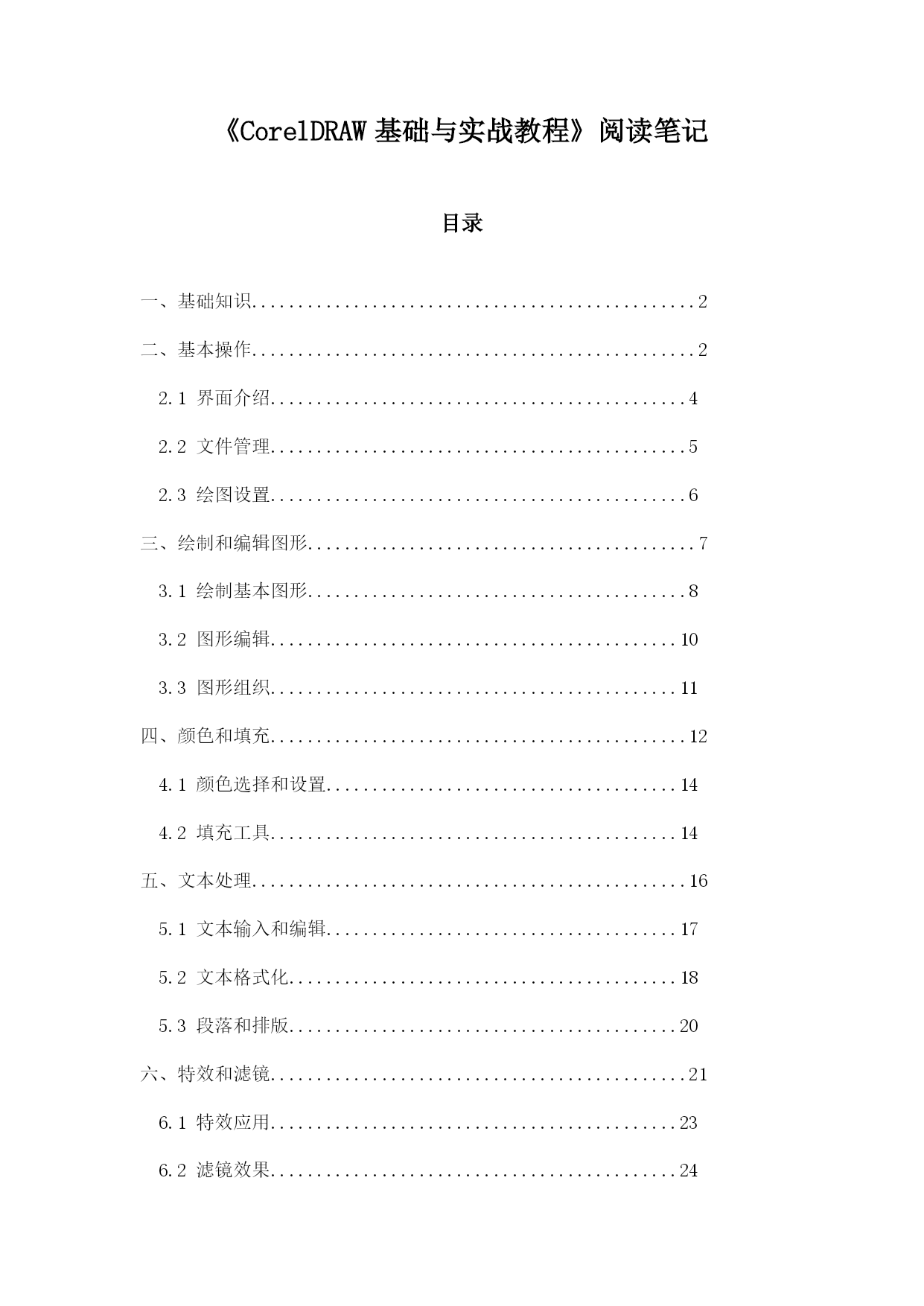 《CorelDRAW基础与实战教程》阅读笔记目录一、基础知识................................................2二、基本操作................................................22.1界面介绍.............................................42.2文件管理.............................................52.3绘图设置........