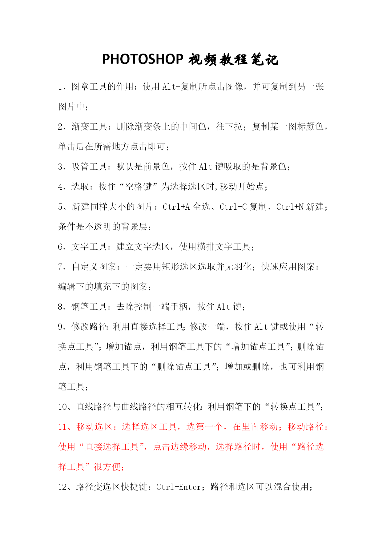 PHOTOSHOP视频教程笔记1、图章工具的作用:使用Alt+复制所点击图像,并可复制到另一张图片中;2、渐变工具:删除渐变条上的中间色,往下拉;复制某一图标颜色,单击后在所需地方点击即可;3、吸管工具:默认是前景色,按住Alt键吸取的是背景色;4、选取:按住“空格键”为选择选区时,移动开始点;5、新建同样大小的图片:Ctrl+A全选、Ctrl+C复制、Ctrl+N新建;条件是不透明的背景层;6、文字工具:建立文字选区,使用横排文字工具;7、自定义图案:一定要用矩形选区选取并无羽化;快速应用图案:编辑下的
