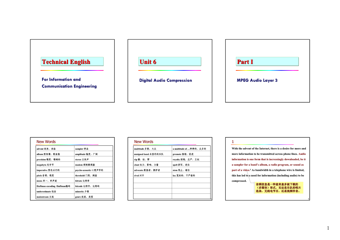 TechnicalEnglishUnit6PartIForInformationandDigitalAudioCompressionMPEGAudioLayer3CommunicationEngineeringNewWordsNewWords1advent到来,来临sampler样品multitude多数,大众amultitudeof…种种的,众多的WiththeadventoftheInternet,thereisadesireformoreandalbum照相簿,歌曲集amplitude幅度,广阔un
