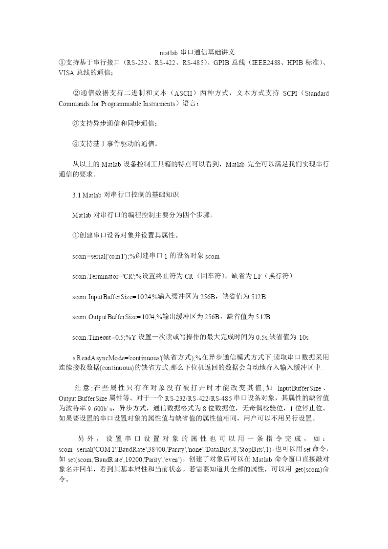 matlab串口通信基础讲义①支持基于串行接口(RS-232、RS-422、RS-485)、GPIB总线(IEEE2488、HPIB标准)、VISA总线的通信;②通信数据支持二进制和文本(ASCII)两种方式,文本方式支持SCPI(StandardCommandsforProgrammableInstruments)语言;③支持异步通信和同步通信;④支持基于事件驱动的通信。从以上的Matlab设备控制工具箱的特点可以看到,Matlab完全可以满足我们实现串行通信的要求。3.1Matlab对串行口控制的基础