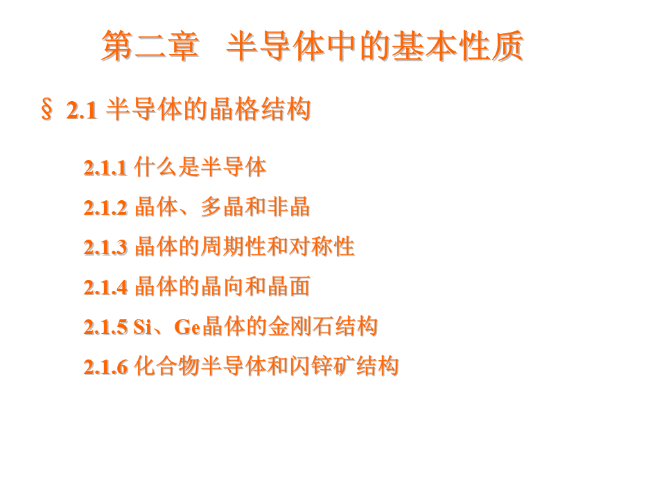 第二章第二章半导体中的基本性质半导体中的基本性质§§2.12.1半导体的晶格结构半导体的晶格结构2.1.1什么是半导体2.1.2晶体、多晶和非晶2.1.3晶体的周期性和对称性2.1.4晶体的晶向和晶面2.1.5Si、Ge晶体的金刚石结构2.1.6化合物半导体和闪锌矿结构§§2.12.1半导体的晶格结构半导体的晶格结构2.1.52.1.5SiSi晶体的晶体的金刚石结构金刚石结构Si、Ge等元素半导体结合形成晶体时,具有金刚石结构形式,它以四面体结构为基础构成。由两个面心立方套构而成,位于不同面心立方中的Si
