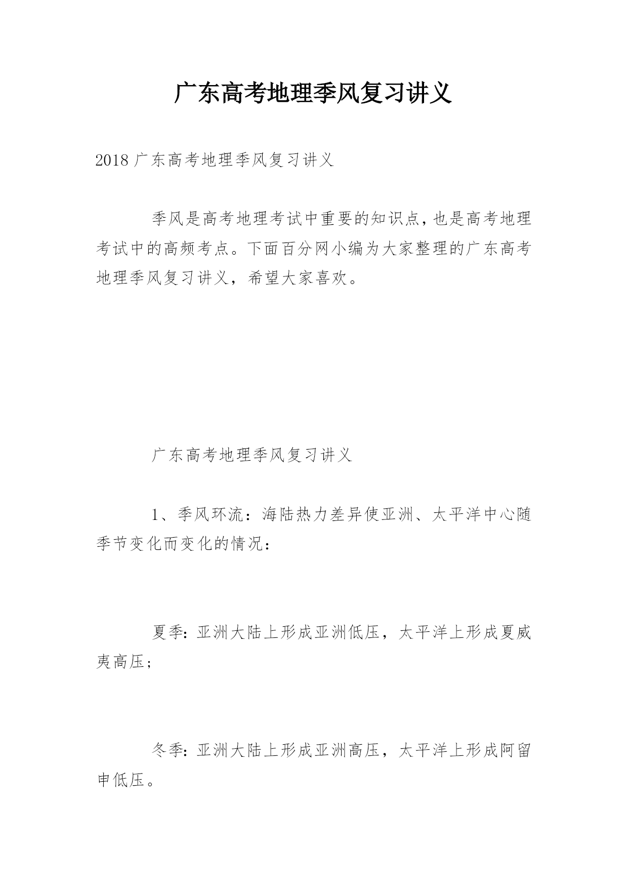 广东高考地理季风复习讲义2018广东高考地理季风复习讲义季风是高考地理考试中重要的知识点,也是高考地理考试中的高频考点。下面百分网小编为大家整理的广东高考地理季风复习讲义,希望大家喜欢。广东高考地理季风复习讲义1、季风环流:海陆热力差异使亚洲、太平洋中心随季节变化而变化的情况:夏季:亚洲大陆上形成亚洲低压,太平洋上形成夏威夷高压;冬季:亚洲大陆上形成亚洲高压,太平洋上形成阿留申低压。2、东亚、南亚季风环流:东亚:夏季东南风,冬季西北风;主要由海陆热力性质差异引起。南亚:夏季西南风,冬季东北风,由风带和气压
