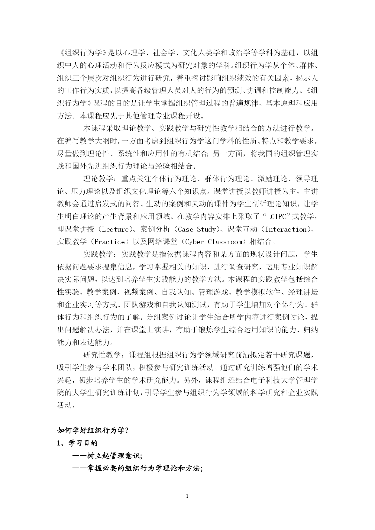 PAGEPAGE55《组织行为学》是以心理学、社会学、文化人类学和政治学等学科为基础,以组织中人的心理活动和行为反应模式为研究对象的学科。组织行为学从个体、群体、组织三个层次对组织行为进行研究,着重探讨影响组织绩效的有关因素,揭示人的工作行为实质,以提高各级管理人员对人的行为的预测、协调和控制能力。《组织行为学》课程的目的是让学生掌握组织管理过程的普遍规律、基本原理和应用方法。本课程应先于其他管理专业课程开设。本课程采取理论教学、实践教学与研究性教学相结合的方法进行教学。在编写教学大纲时,一方