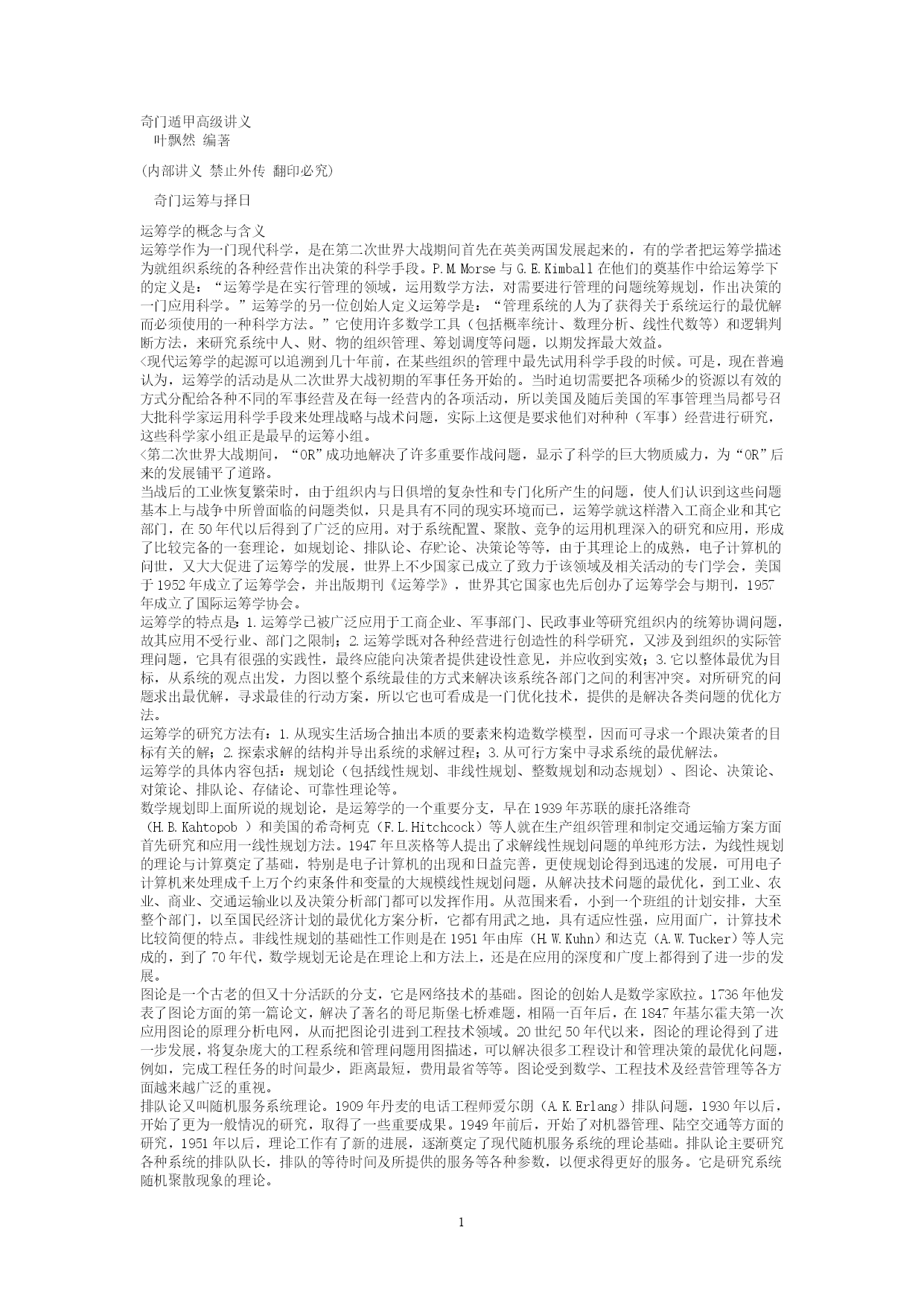 PAGEPAGE12奇门遁甲高级讲义叶飘然编著(内部讲义禁止外传翻印必究)奇门运筹与择日运筹学的概念与含义运筹学作为一门现代科学,是在第二次世界大战期间首先在英美两国发展起来的,有的学者把运筹学描述为就组织系统的各种经营作出决策的科学手段。P.M.Morse与G.E.Kimball在他们的奠基作中给运筹学下的定义是:“运筹学是在实行管理的领域,运用数学方法,对需要进行管理的问题统筹规划,作出决策的一门应用科学。”运筹学的另一位创始人定义运筹学是:“管理系统的人为了获得关于系统运行的最优解而必须