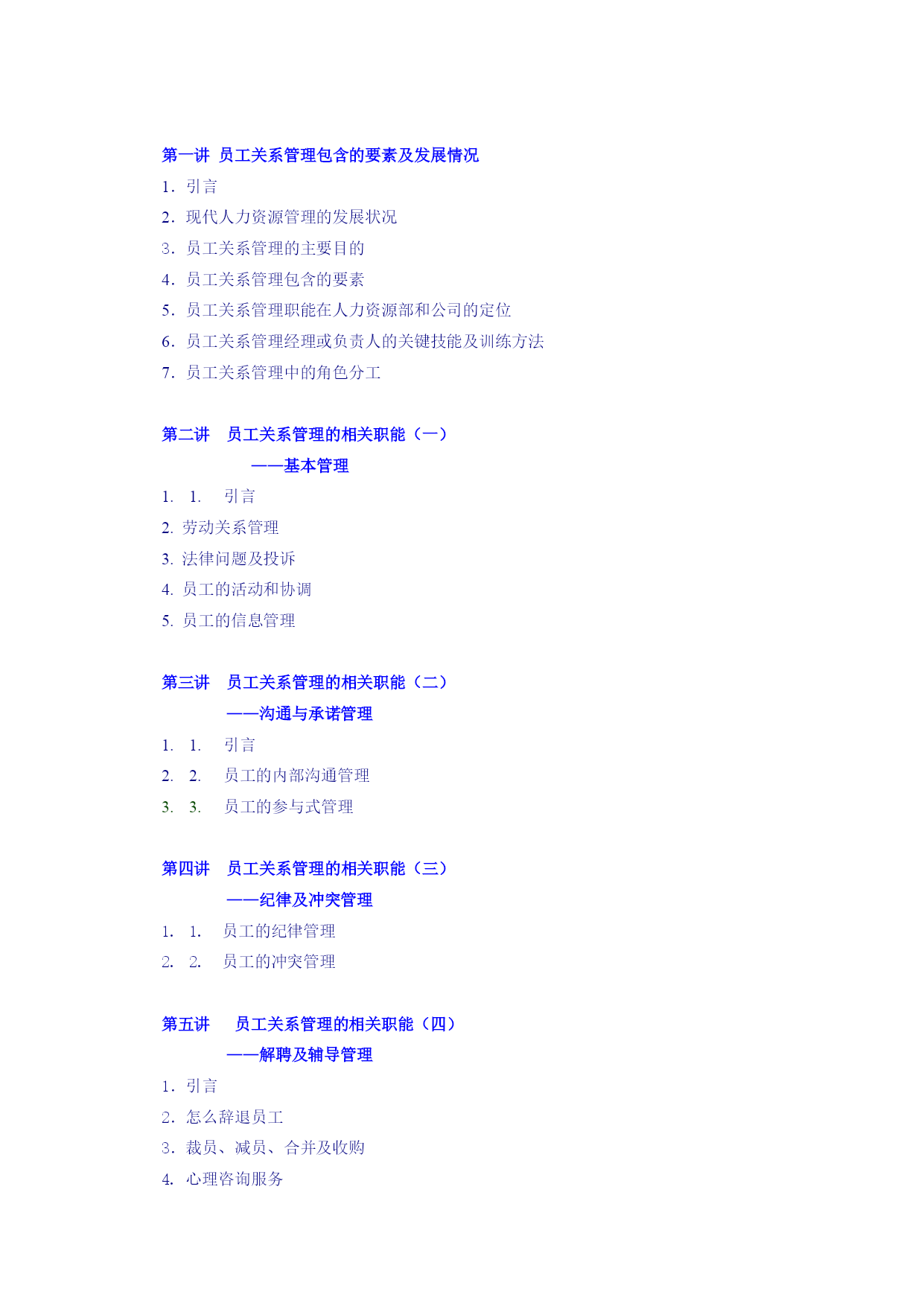 第一讲员工关系管理包含的要素及发展情况1.引言2.现代人力资源管理的发展状况3.员工关系管理的主要目的4.员工关系管理包含的要素5.员工关系管理职能在人力资源部和公司的定位6.员工关系管理经理或负责人的关键技能及训练方法7.员工关系管理中的角色分工第二讲员工关系管理的相关职能(一)——基本管理1.引言2.劳动关系管理3.法律问题及投诉4.员工的活动和协调5.员工的信息管理第三讲员工关系管理的相关职能(二)——沟通与承诺管理1.引言2.员工的内部沟通管理3.员工的参与式管理第四讲员工关系管理的相关职能(三)