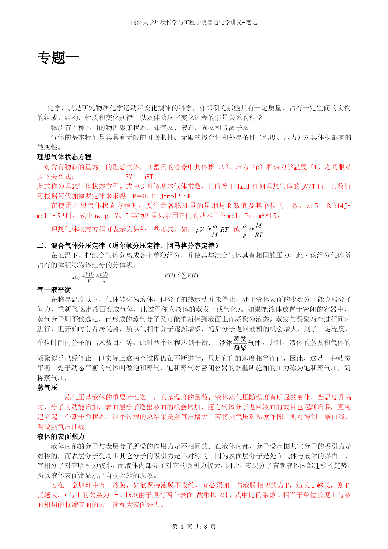 同济大学环境科学与工程学院普通化学讲义+笔记PAGE第PAGE8页共NUMPAGES8页专题一化学,就是研究物质化学运动和变化规律的科学,亦即研究那些具有一定质量、占有一定空间的实物的组成、结构、性质和变化规律,以及伴随这些变化过程的能量关系的科学。物质有4种不同的物理聚集状态,即气态、液态、固态和等离子态。气体的基本特征是其具有无限的可膨胀性、无限的掺合性和外界条件(温度、压力)对其体积影响的敏感性。理想气体状态方程对含有物质的量为n的理想气体,在密闭的容器中其体积(V)、压力(p)和