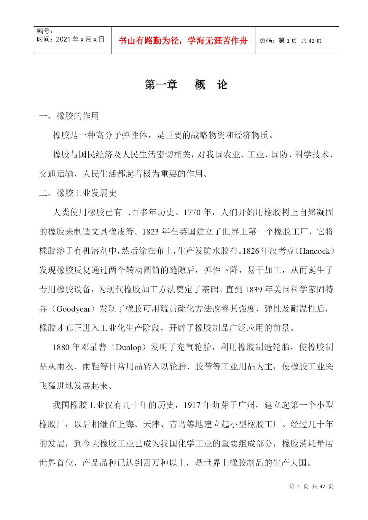 编号:时间:2021年x月x日书山有路勤为径,学海无涯苦作舟页码:第PAGE42页共NUMPAGES42页第PAGE\*MERGEFORMAT42页共NUMPAGES\*MERGEFORMAT42页第一章概论一、橡胶的作用橡胶是一种高分子弹性体,是重要的战略物资和经济物质。橡胶与国民经济及人民生活密切相关,对我国农业、工业、国防、科学技术、交通运输、人民生活都起着极为重要的作用。二、橡胶工业发展史人类使用橡胶已有二百多年历史。1770年,人们开始用橡胶树上自然凝固的橡胶来制造文具橡