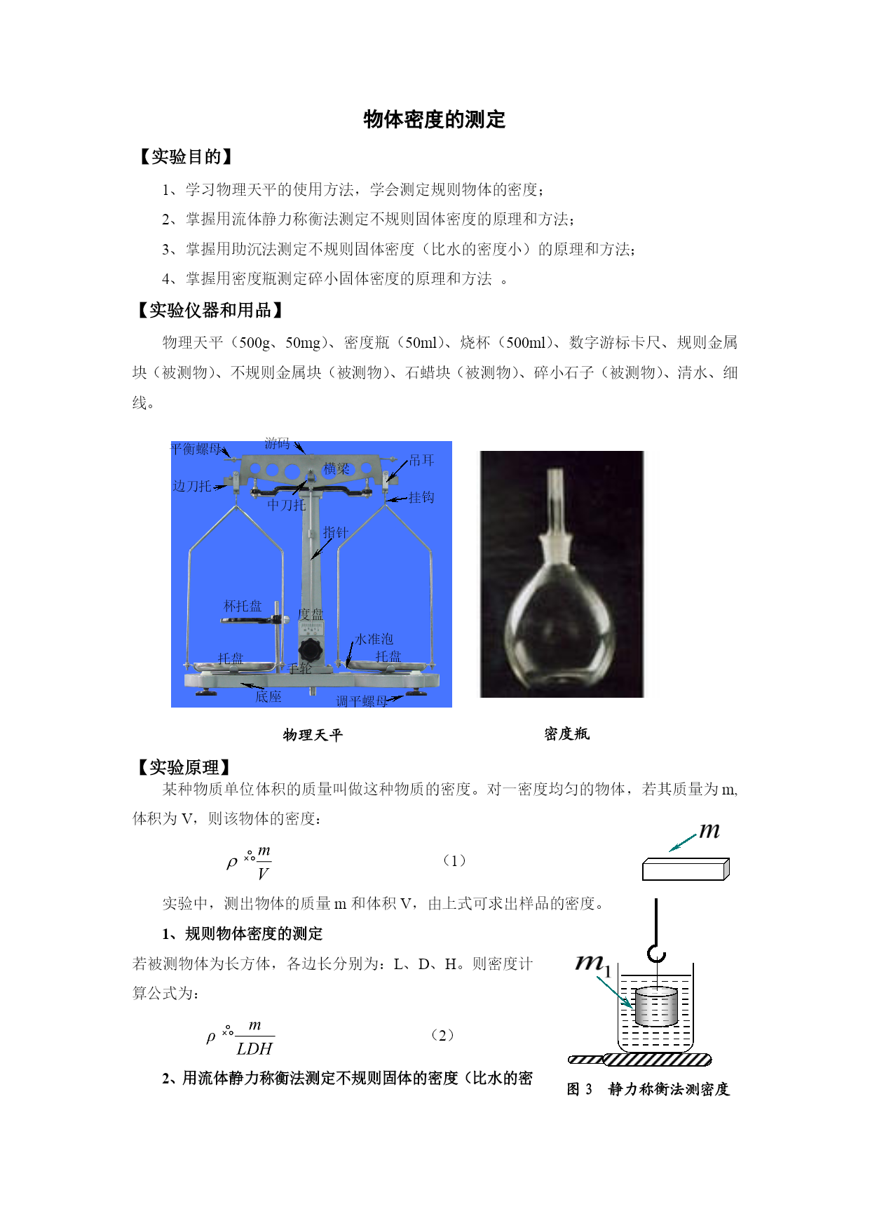 物体密度的测定【实验目的】1、学习物理天平的使用方法,学会测定规则物体的密度;2、掌握用流体静力称衡法测定不规则固体密度的原理和方法;3、掌握用助沉法测定不规则固体密度(比水的密度小)的原理和方法;4、掌握用密度瓶测定碎小固体密度的原理和方法。【实验仪器和用品】物理天平(500g、50mg)、密度瓶(50ml)、烧杯(500ml)、数字游标卡尺、规则金属块(被测物)、不规则金属块(被测物)、石蜡块(被测物)、碎小石子(被测物)、清水、细线。密度瓶游码平衡螺母边刀托杯托盘底座度盘指针中刀托手轮调平螺母挂钩吊