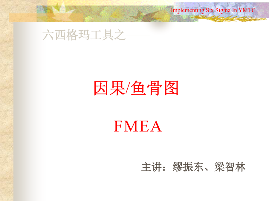 因果/鱼骨图FMEA主讲:缪振东、梁智林因果/鱼骨图(Cause&Effect/FishboneDiagram)一.什么是6M?二.因果/鱼骨图1.因果/鱼骨图的作用◇使项目小组能集中于问题的实质内容,而不是问题的历史或组员的不同的个人观点◇使组员了解项目小组在围绕某个问题时产生的集体智慧和意见,有助于找到有效的解决方案◇使项目小组聚焦于问题的原因,而不是问题的症状3.因果图分析的步骤因果分析是一种小组技巧,其基本程序:(1)确定问题或特性(2)确定主要问题的类别(3)根据原因类别,确定中间原因(4)确定