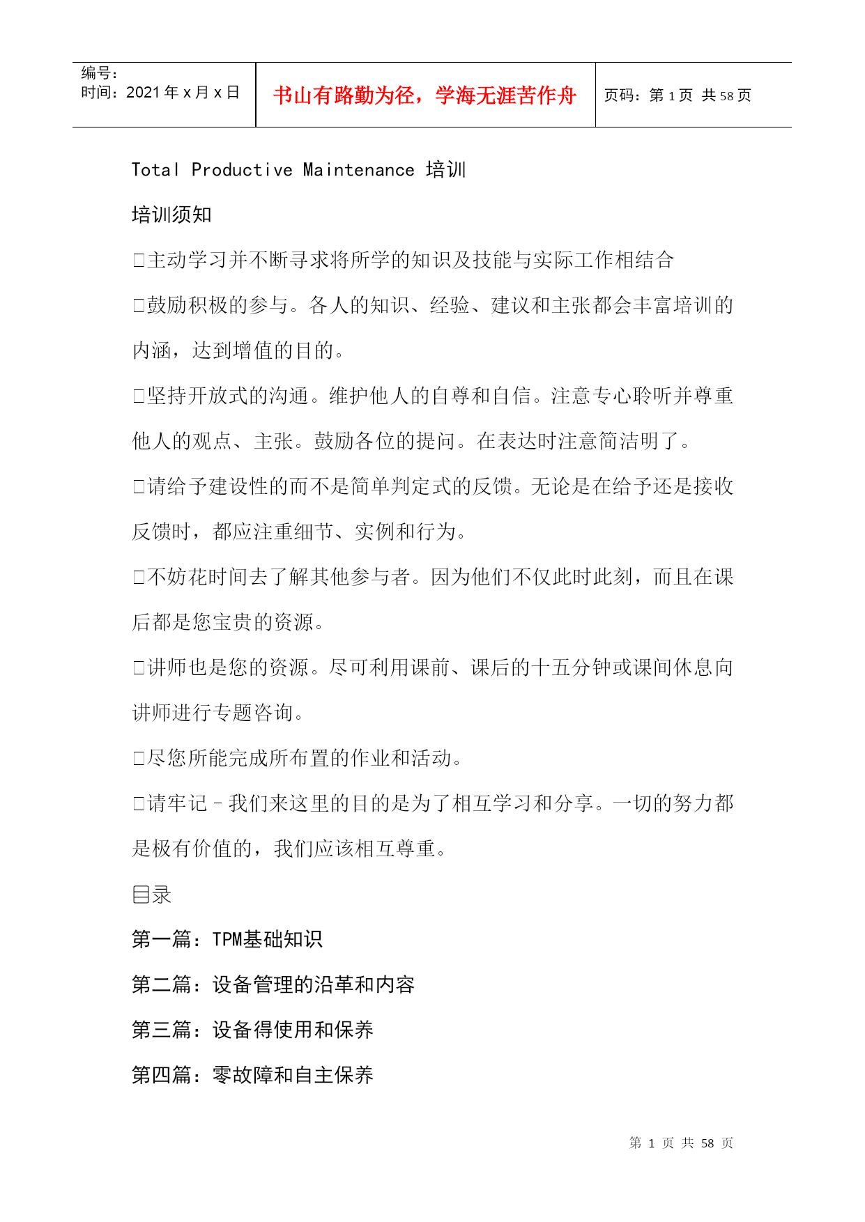 编号:时间:2021年x月x日书山有路勤为径,学海无涯苦作舟页码:第PAGE58页共NUMPAGES58页第PAGE\*MERGEFORMAT58页共NUMPAGES\*MERGEFORMAT58页TotalProductiveMaintenance培训培训须知主动学习并不断寻求将所学的知识及技能与实际工作相结合鼓励积极的参与。各人的知识、经验、建议和主张都会丰富培训的内涵,达到增值的目的。坚持开放式的沟通。维护他人的自尊和自信。注意专心聆听并尊重他人的观点、主张。鼓励各位的