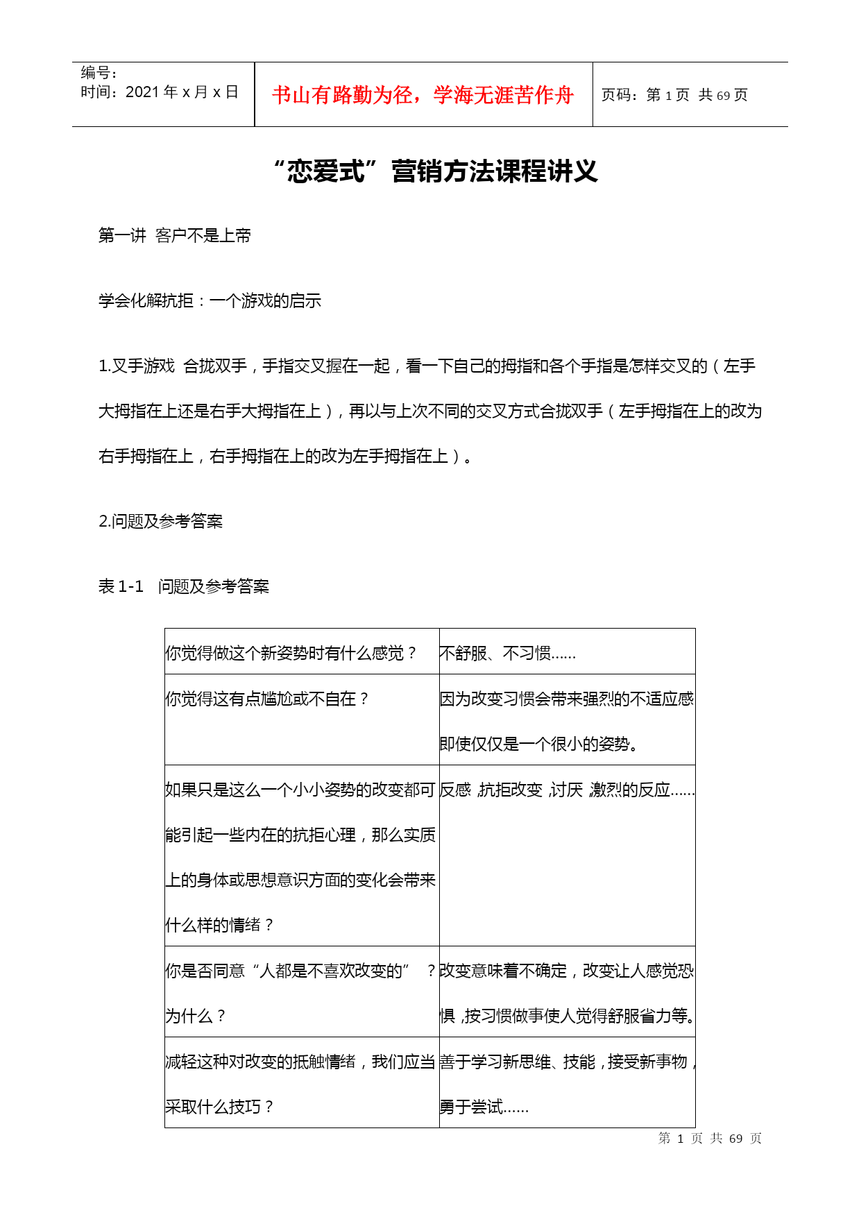 编号:时间:2021年x月x日书山有路勤为径,学海无涯苦作舟页码:第PAGE69页共NUMPAGES69页第PAGE\*MERGEFORMAT69页共NUMPAGES\*MERGEFORMAT69页“恋爱式”营销方法课程讲义第一讲客户不是上帝学会化解抗拒:一个游戏的启示1.叉手游戏合拢双手,手指交叉握在一起,看一下自己的拇指和各个手指是怎样交叉的(左手大拇指在上还是右手大拇指在上),再以与上次不同的交叉方式合拢双手(左手拇指在上的改为右手拇指在上,右手拇指在上的改为左手拇指在上)。