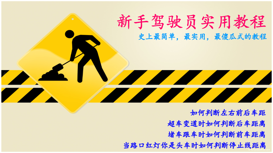 一、超车变道时如何判断后车距离:2、车影占后视镜2/3——车距为5m3、车影占后视镜1/2——车距为9mTitle二、堵车跟车时如何判断前车距离:跟车距离一般在2米左右较合适,太近容易造成追尾事故,太远会被其他车辆插入。一般情况下,根据驾驶员从本车前部轮廓线看到前车后保险杠及轮胎的位置来判断:1、看见前车后保险杠上沿——车距为1mTitleTitle三、当路口红灯你是头车时如何判断停止线距离:在车内通过车窗看到停止线与前门角五厘米处,则车子与停止线对齐。TitleTitleTitleTitleTitle说