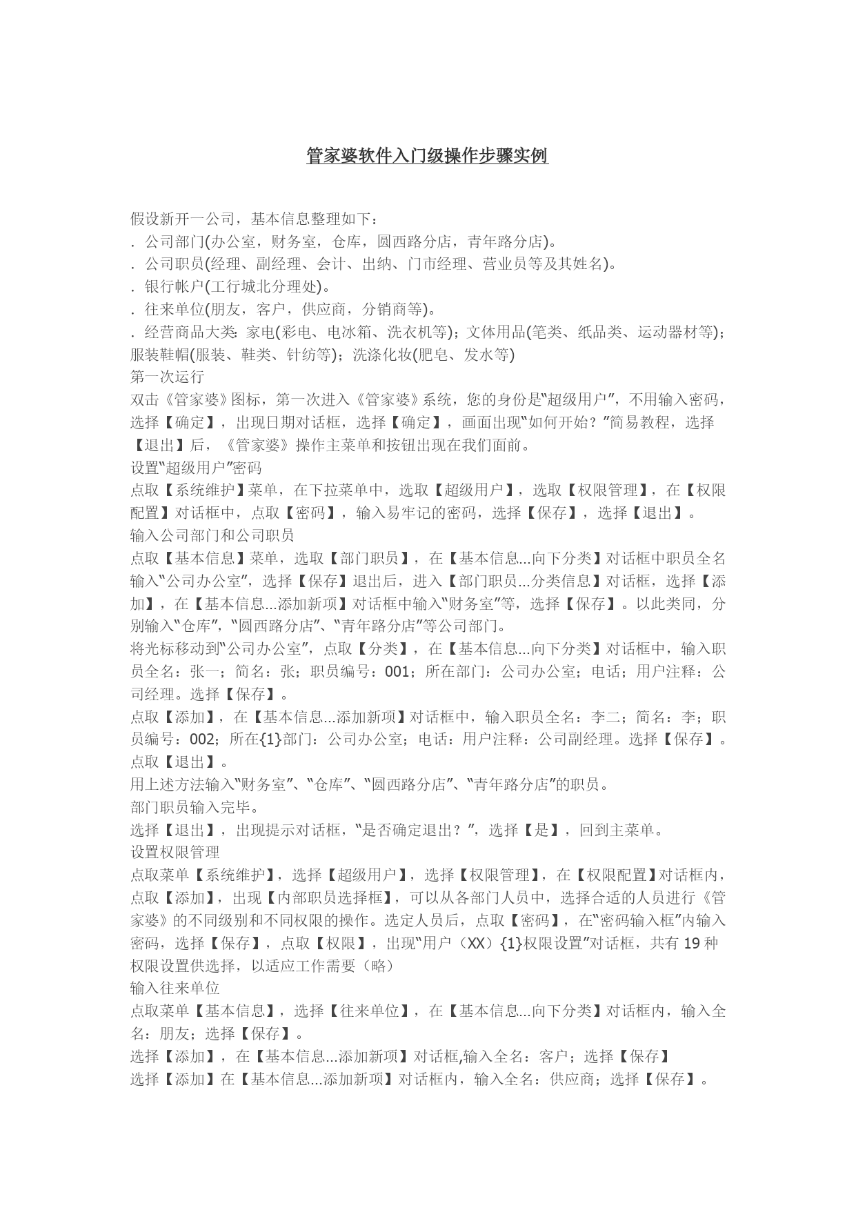 HYPERLINK"http://www.word114.com/forum.php?mod=viewthread&tid=41"管家婆软件入门级操作步骤实例假设新开一公司,基本信息整理如下:.公司部门(办公室,财务室,仓库,圆西路分店,青年路分店)。.公司职员(经理、副经理、会计、出纳、门市经理、营业员等及其姓名)。.银行帐户(工行城北分理处)。.往来单位(朋友,客户,供应商,分销商等)。.经营商品大类:家电(彩电、电冰箱、洗衣机等);文体用品(笔类、纸品类、运动器材等);服装鞋帽(服装、鞋类、针
