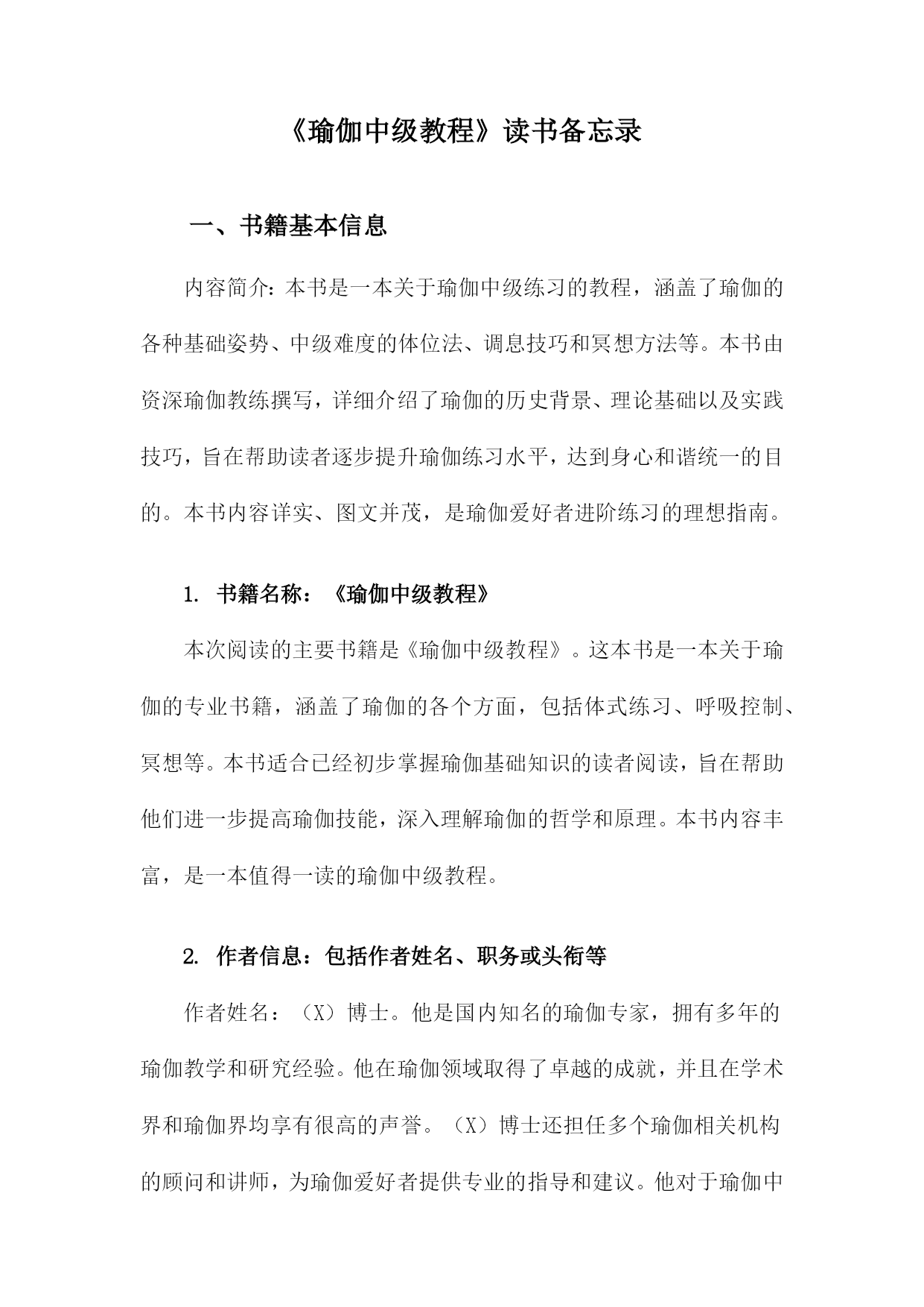 《瑜伽中级教程》读书备忘录一、书籍基本信息内容简介:本书是一本关于瑜伽中级练习的教程,涵盖了瑜伽的各种基础姿势、中级难度的体位法、调息技巧和冥想方法等。本书由资深瑜伽教练撰写,详细介绍了瑜伽的历史背景、理论基础以及实践技巧,旨在帮助读者逐步提升瑜伽练习水平,达到身心和谐统一的目的。本书内容详实、图文并茂,是瑜伽爱好者进阶练习的理想指南。1.书籍名称:《瑜伽中级教程》本次阅读的主要书籍是《瑜伽中级教程》。这本书是一本关于瑜伽的专业书籍,涵盖了瑜伽的各个方面,包括体式练习、呼吸控制、冥想等。本书适合已经初步掌